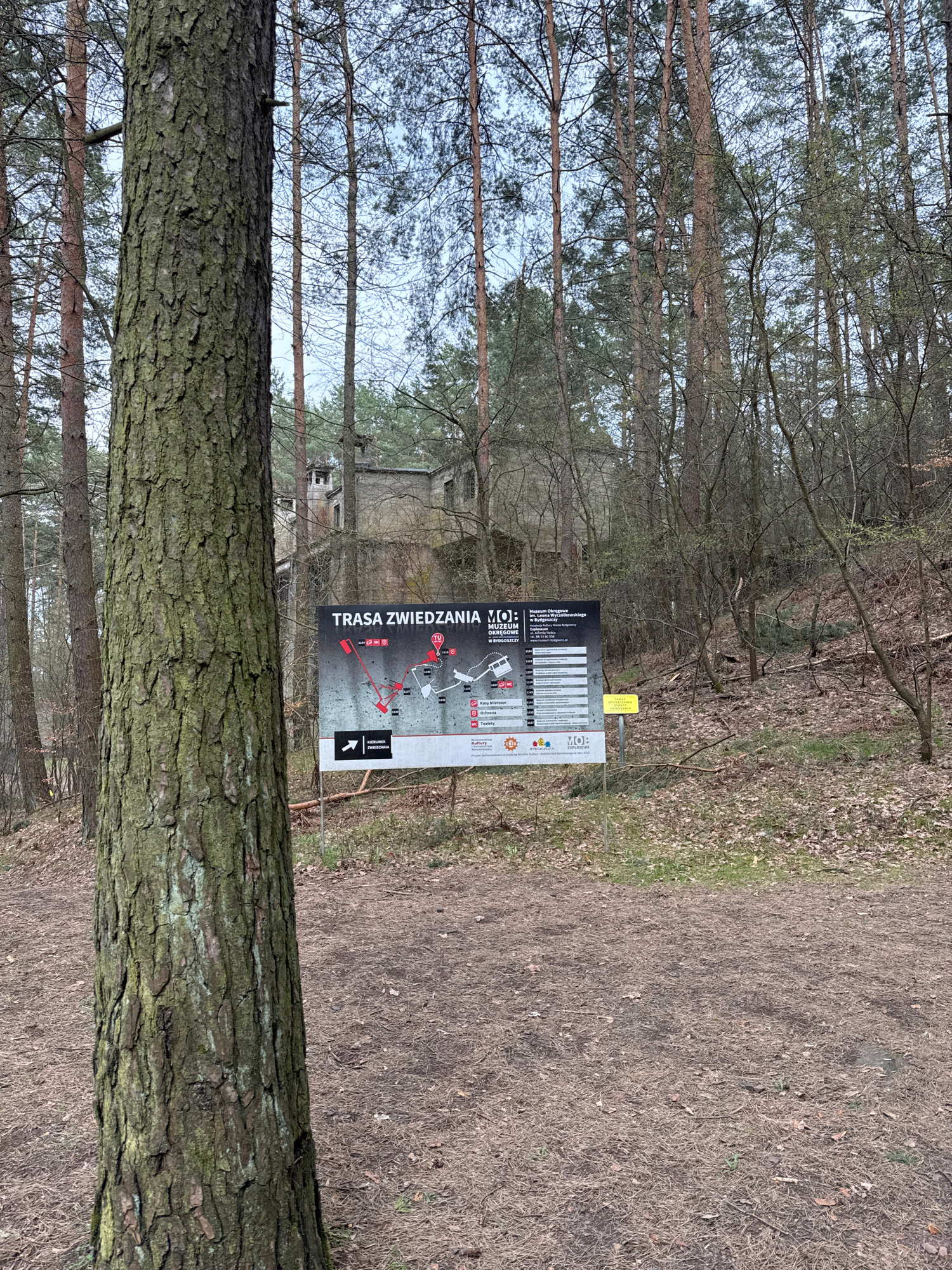 The image captures a serene outdoor scene, likely a historical or nature park, in what appears to be early spring or late autumn. A wide dirt path, covered with dry leaves and sparse grass, stretches…read more