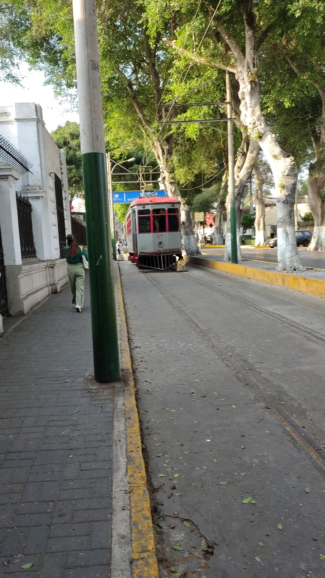 The image captures a street scene in Barranco, Peru. A vintage red and white tram occupies the street. A person dressed in green stands next to a green and white painted pole. The street is lined withβ¦read more