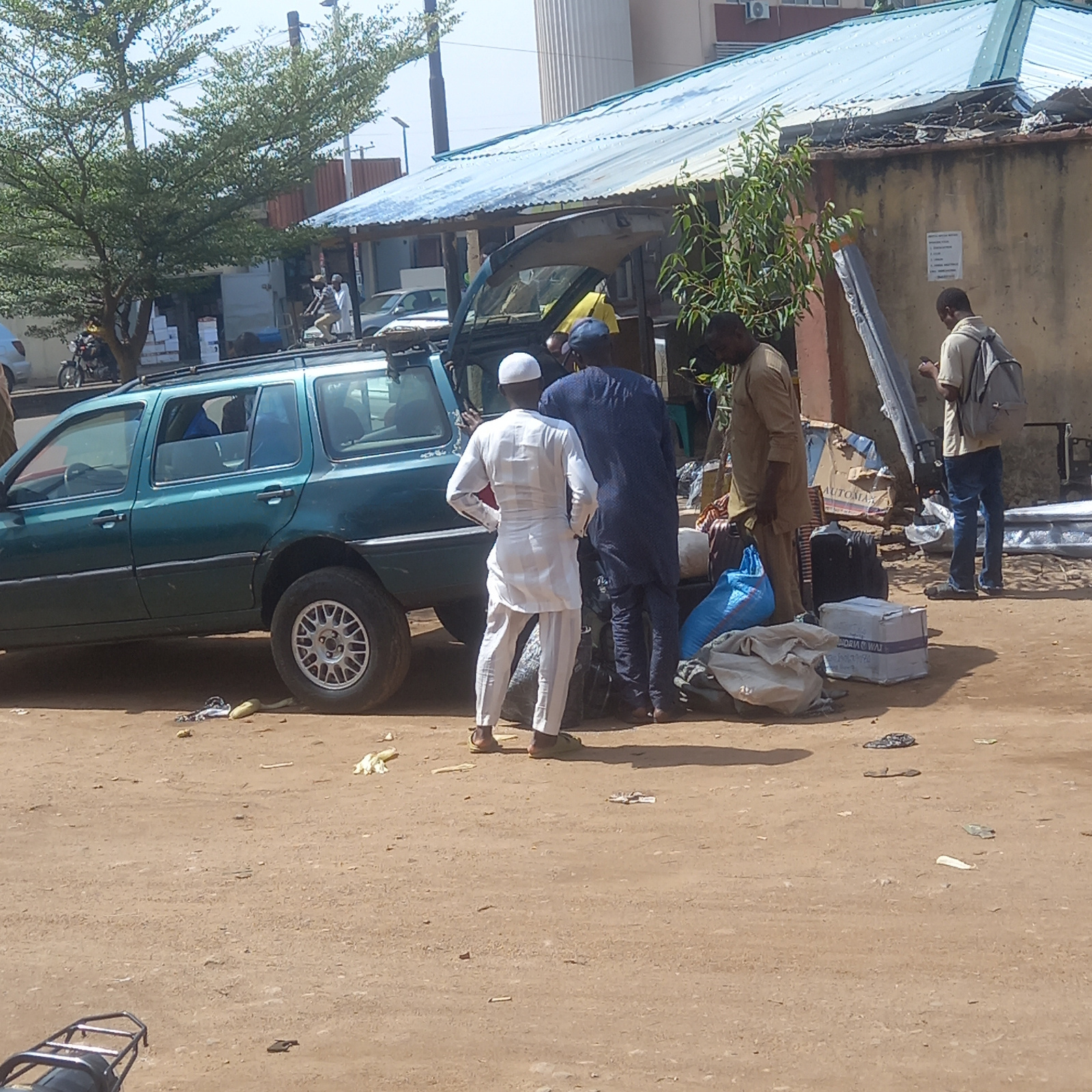 A partly obscured green station wagon is parked on a dirt surface next to a building with a light blue corrugated metal roof. Four people are visible near the vehicle, seemingly loading items onto it.…read more