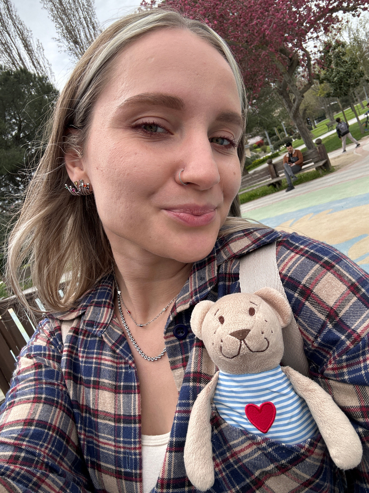 A selfie of a woman in a plaid shirt is the primary focus. She has blonde hair with a streak of white. She has on a silver chain necklace and colorful earrings. She has a nose ring. She is holding a t…read more