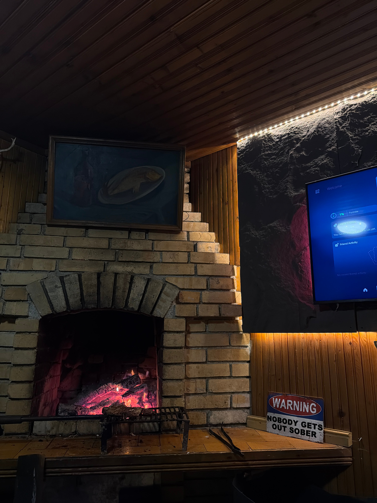 The image shows the interior of a room featuring a brick fireplace with a fire burning inside. Above the fireplace is a television, and next to it is a "Warning: Nobody Gets Out Sober" sign. To the le…read more