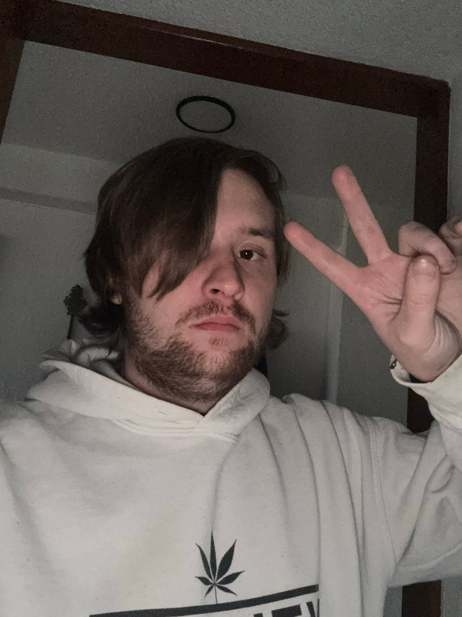 A man is indoors, potentially in a room with light-colored walls. He is wearing a white hooded sweatshirt, and he is making a peace sign with his hand. There is a dark wooden frame visible, possibly a…read more