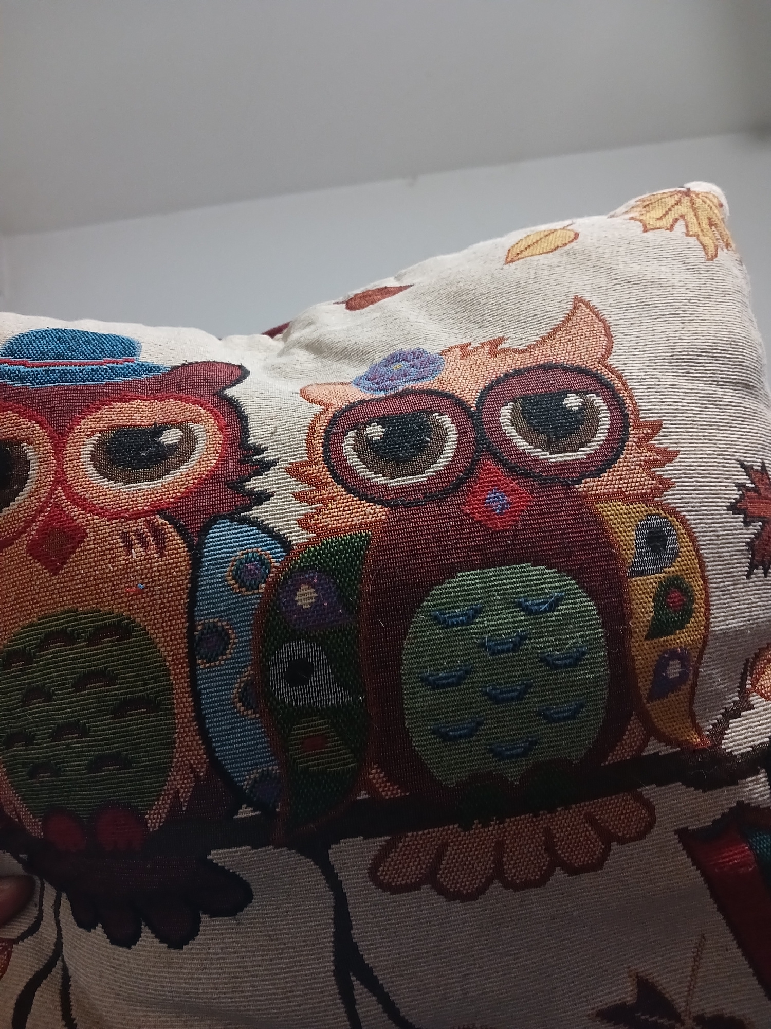 A close-up shot of a pillow with a woven owl design. The pillow has a beige background with colorful owls and maple leaves. The pillow is in front of a white wall and illuminated by sunlight from the…read more