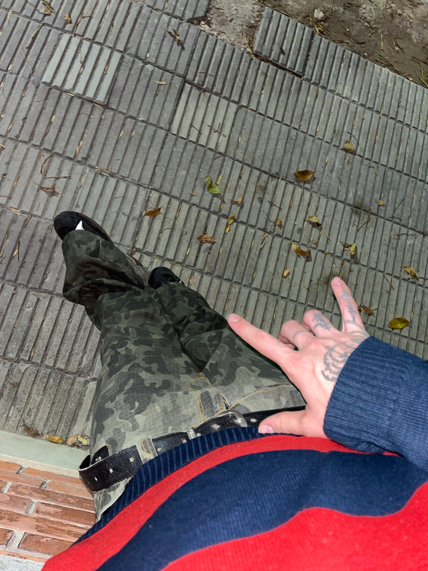 A person stands on a metal grid walkway in Bahía Blanca, Argentina. The walkway borders a rough patch of ground with scattered leaves. The person wears black shoes, camouflage pants with a black leath…read more