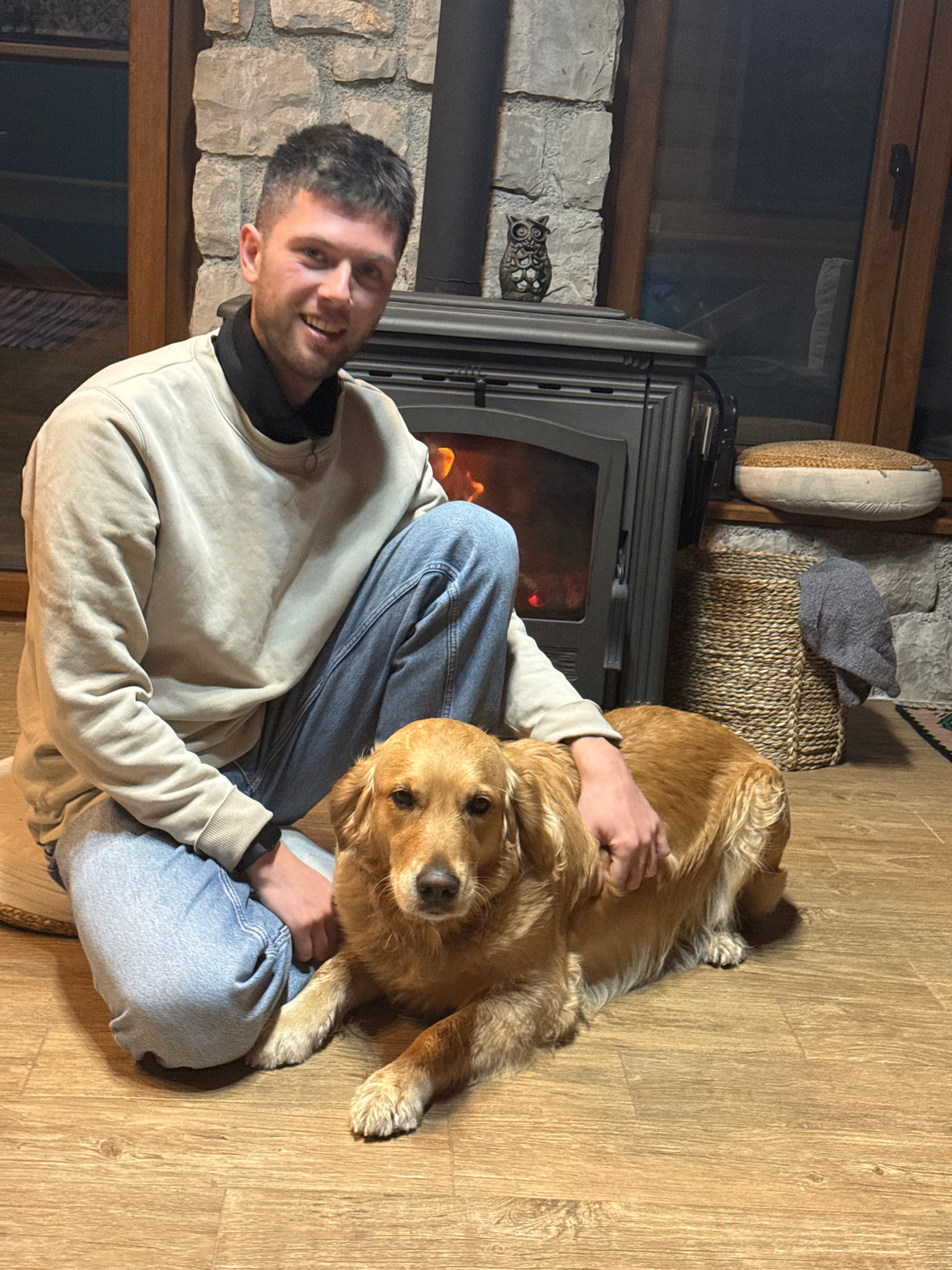 An indoor scene in Drijenak, Montenegro, depicts a male individual and a golden retriever dog on a light-colored wooden floor. The male, with short dark hair, a clean-shaven face, and wearing a beige…read more