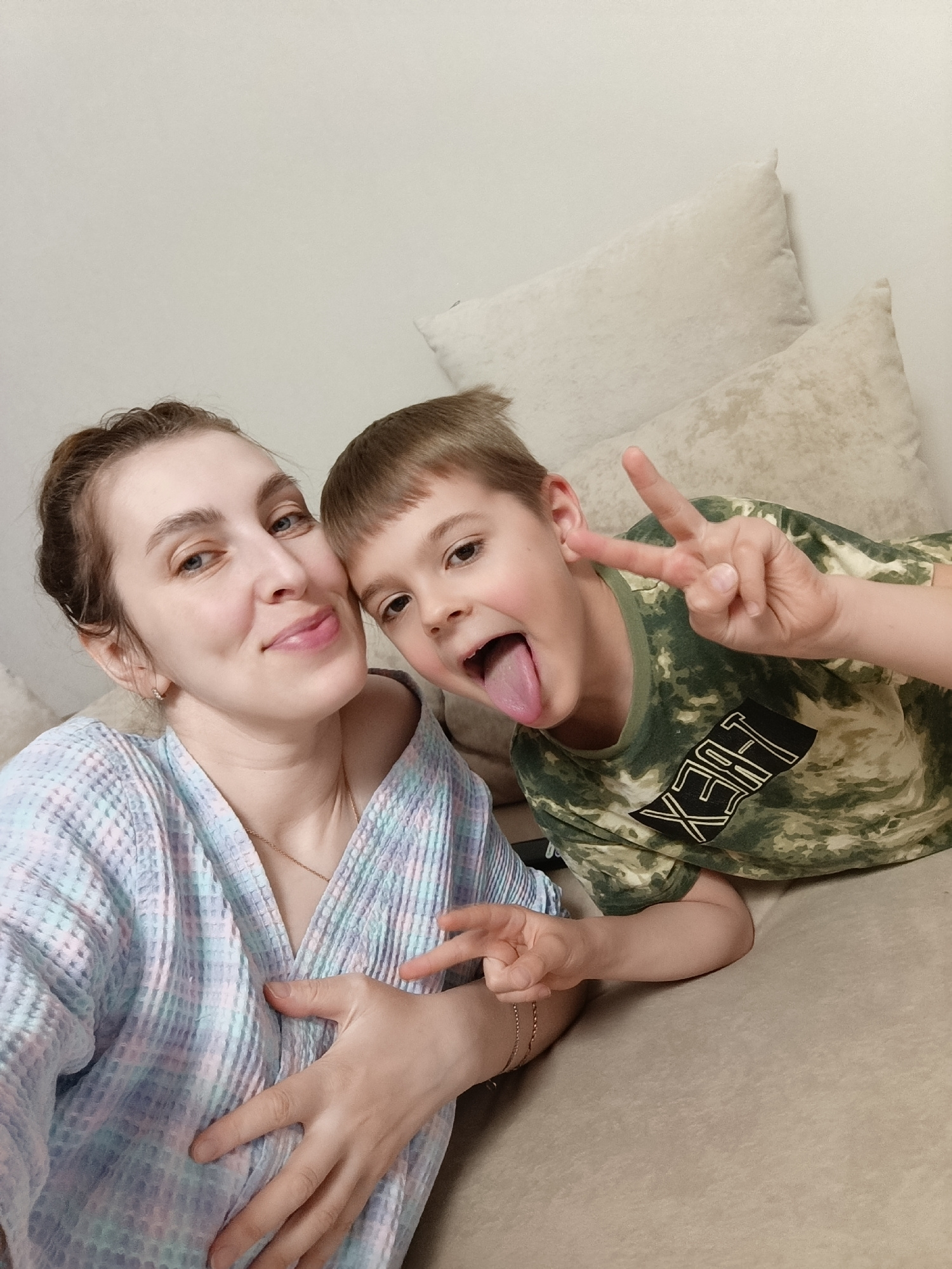 The image shows a selfie taken indoors, apparently in a private residence. A woman with light skin, brown hair pulled back, and wearing a pastel-colored robe is positioned on the left side of the fram…read more