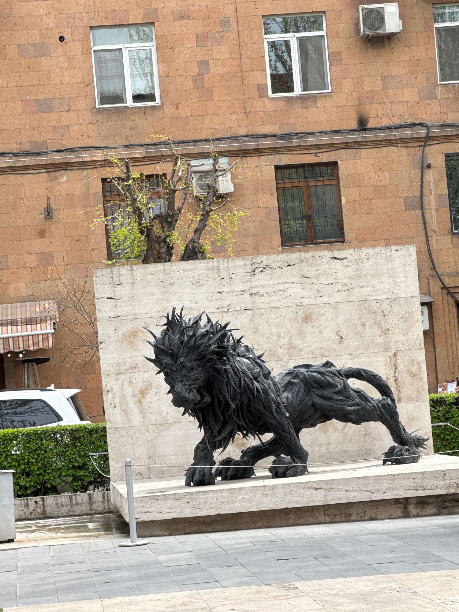 The image shows an exterior view in Yerevan, Armenia, featuring architectural elements and a sculpture. A light brown building with windows and an air conditioning unit is visible on the left. Adjacen…read more