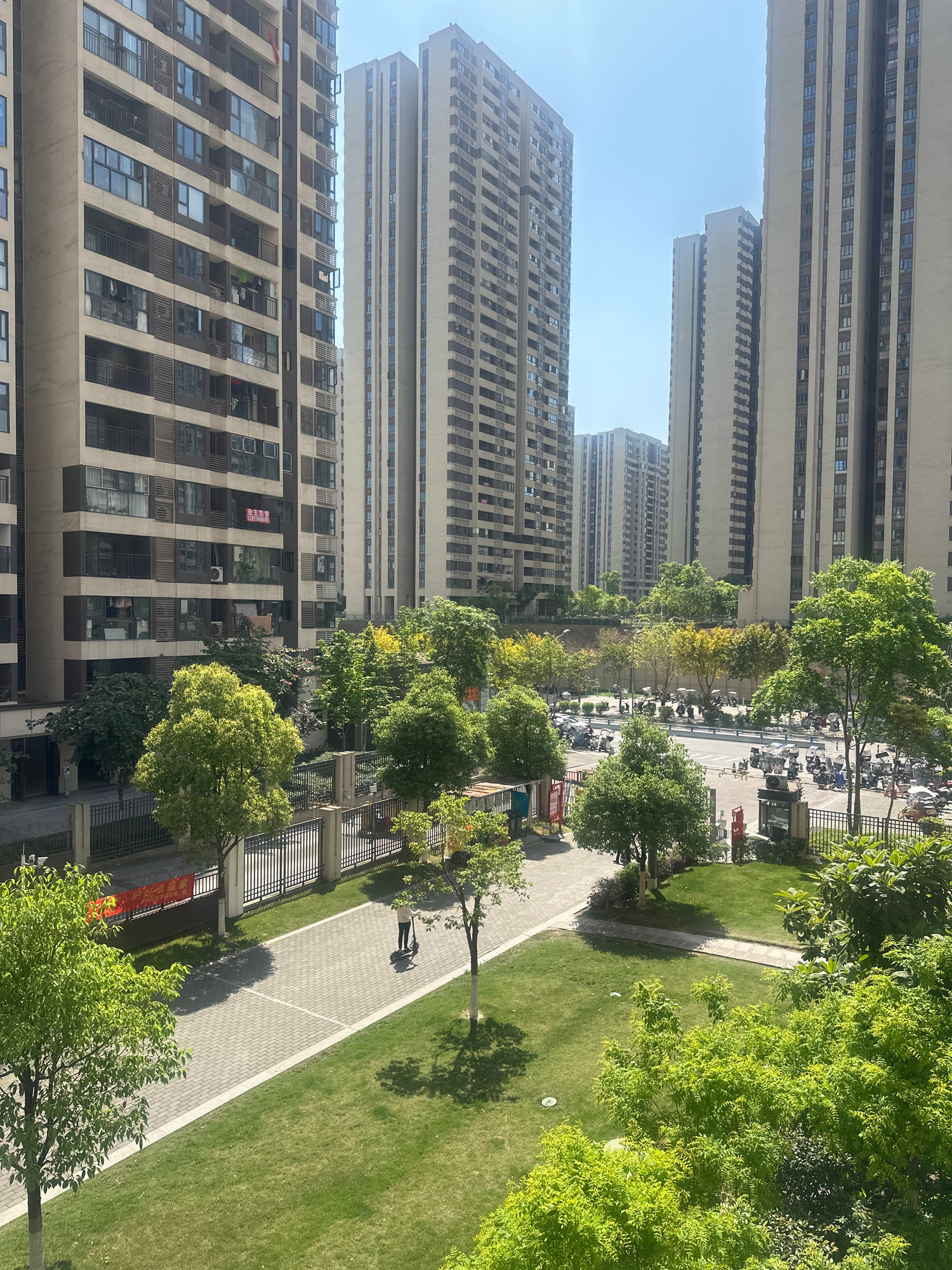 The image shows an elevated view of a modern urban landscape in Chongqing High-tech Zone, China. Predominantly, there are several high-rise apartment buildings of varying heights, with a modern archit…read more