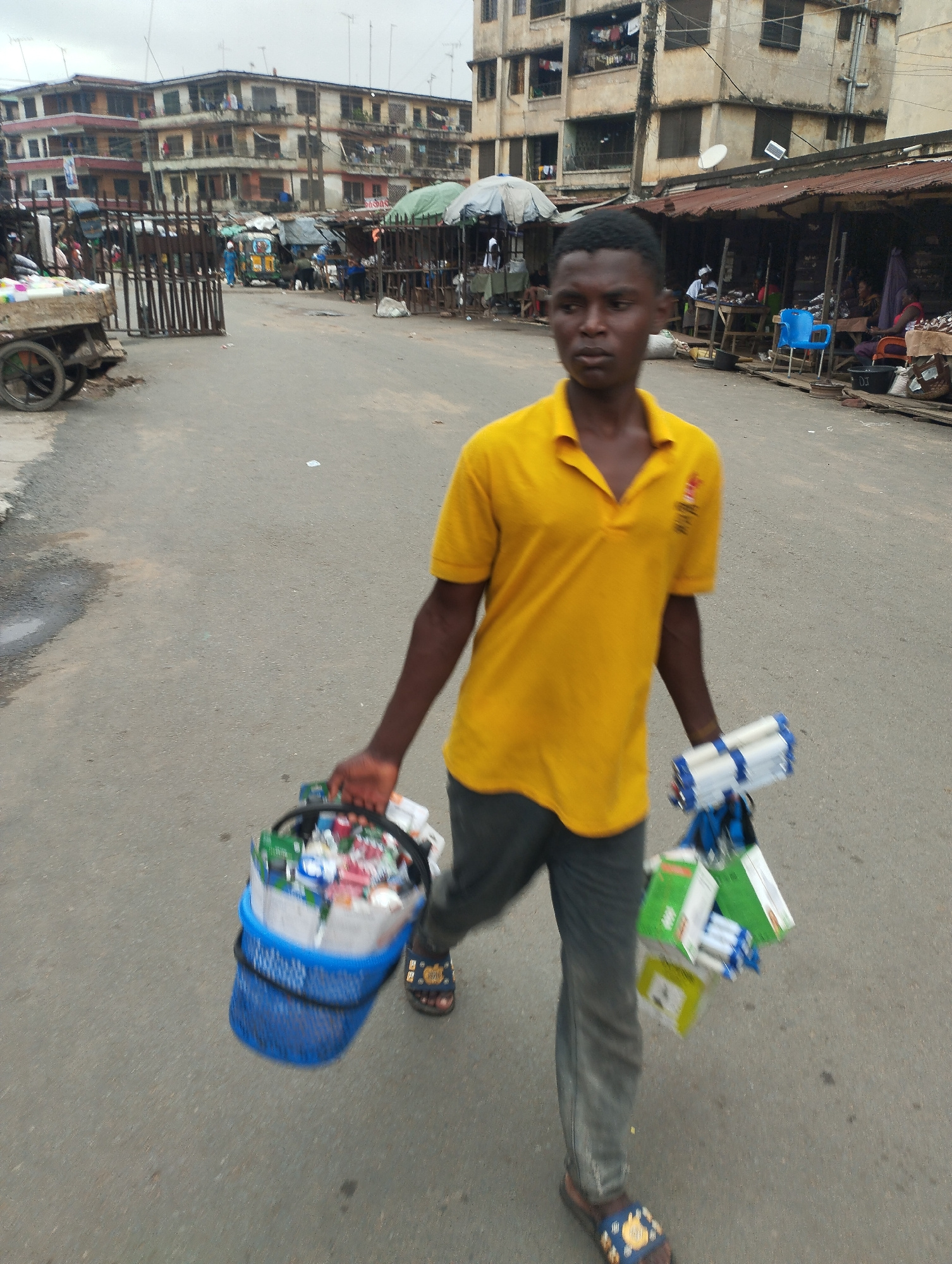 A young man in a yellow polo shirt and gray pants walks down a gray asphalt road in Fegge, Nigeria. He carries a blue plastic basket overflowing with miscellaneous items in his left hand and a bundleโ€ฆread more
