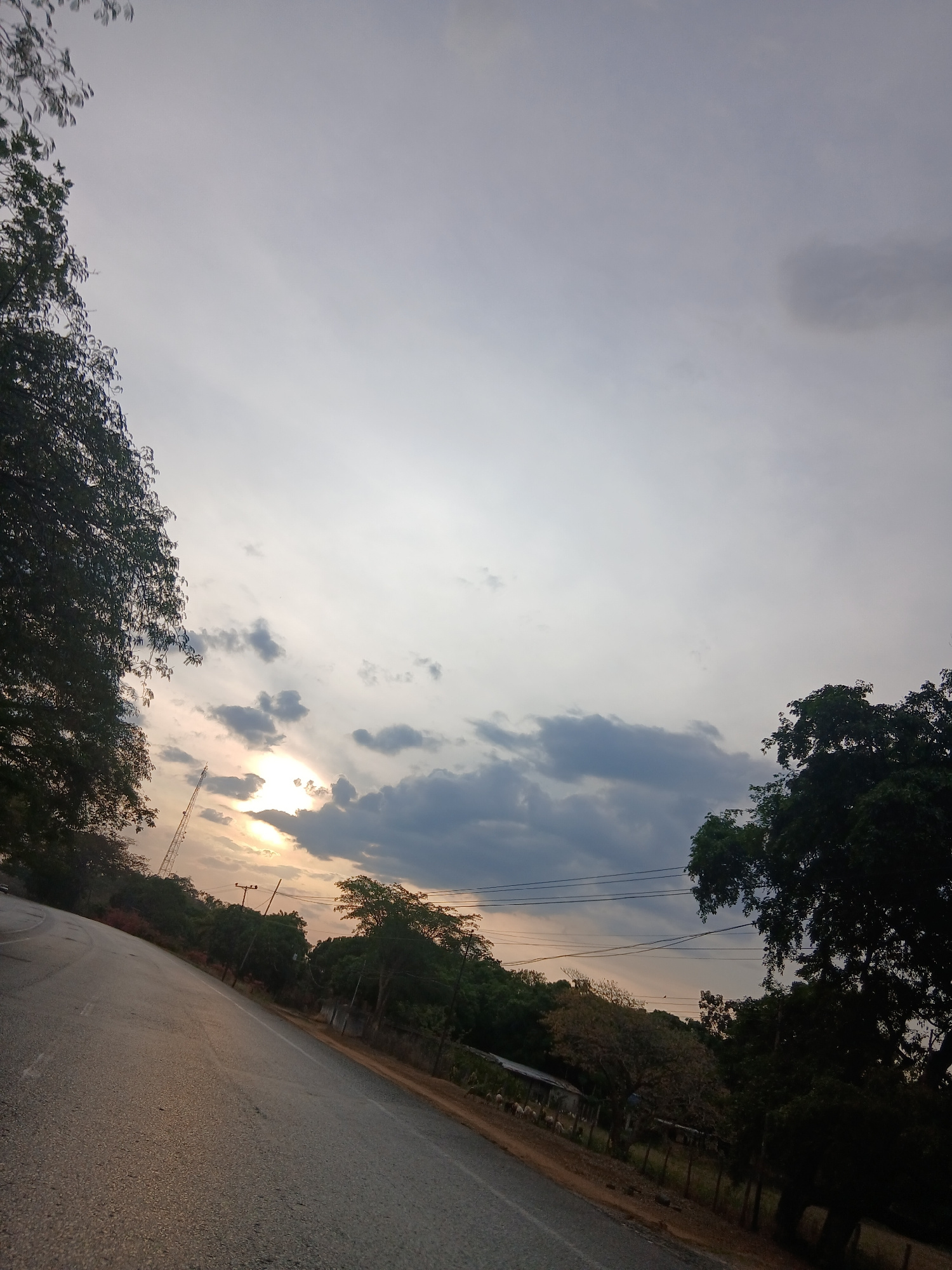 The image shows a view of Lomas del Viento, Venezuela, facing an asphalt road with trees lining the side and the sky above. The sky is overcast with a mix of clouds and visible sunlight. Electrical wi…read more