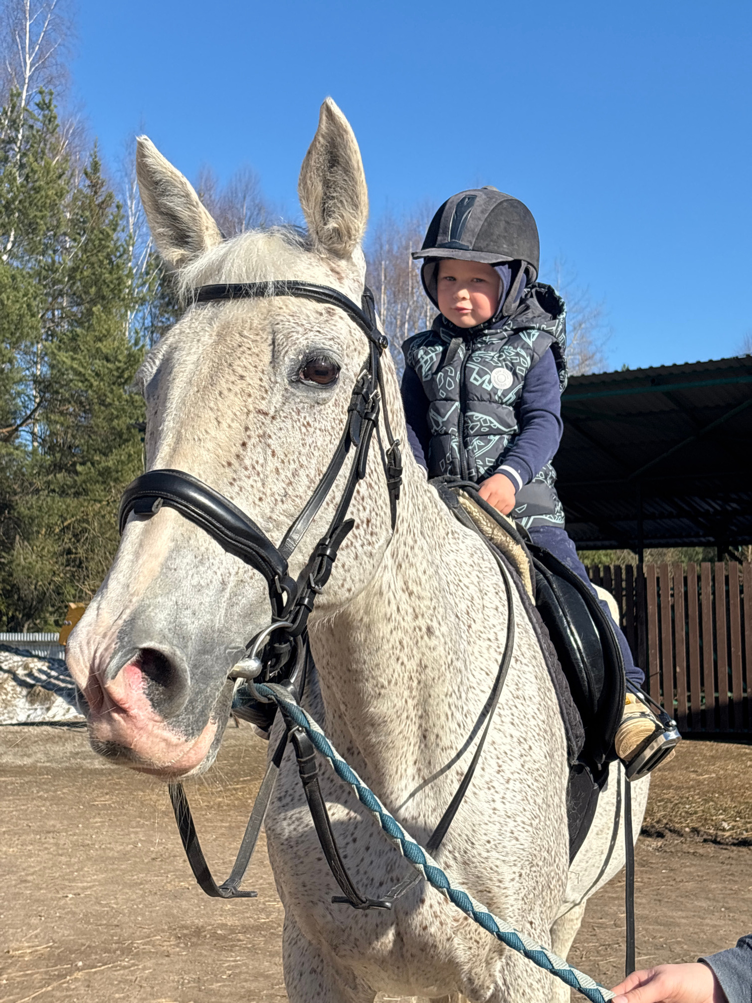 A young child wearing a riding helmet and vest sits atop a grey dappled horse. The horse is equipped with a bridle and reins. The location appears to be an outdoor riding arena or stable area. The sky…read more