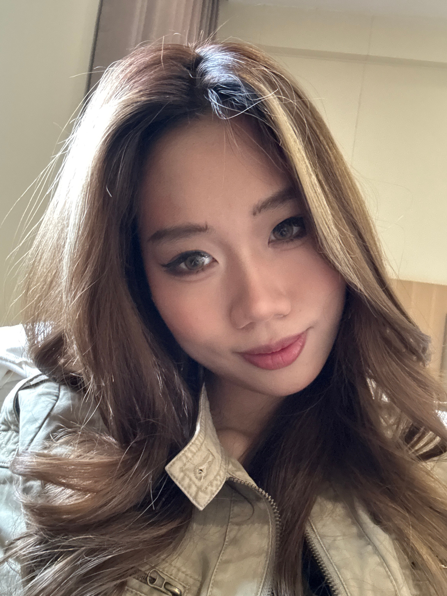 The image is a close-up, slightly angled selfie of a woman with long, light brown hair. Her hair has blonde highlights and frames her face. She has light skin, brown eyes, and pink lips. She appears t…read more