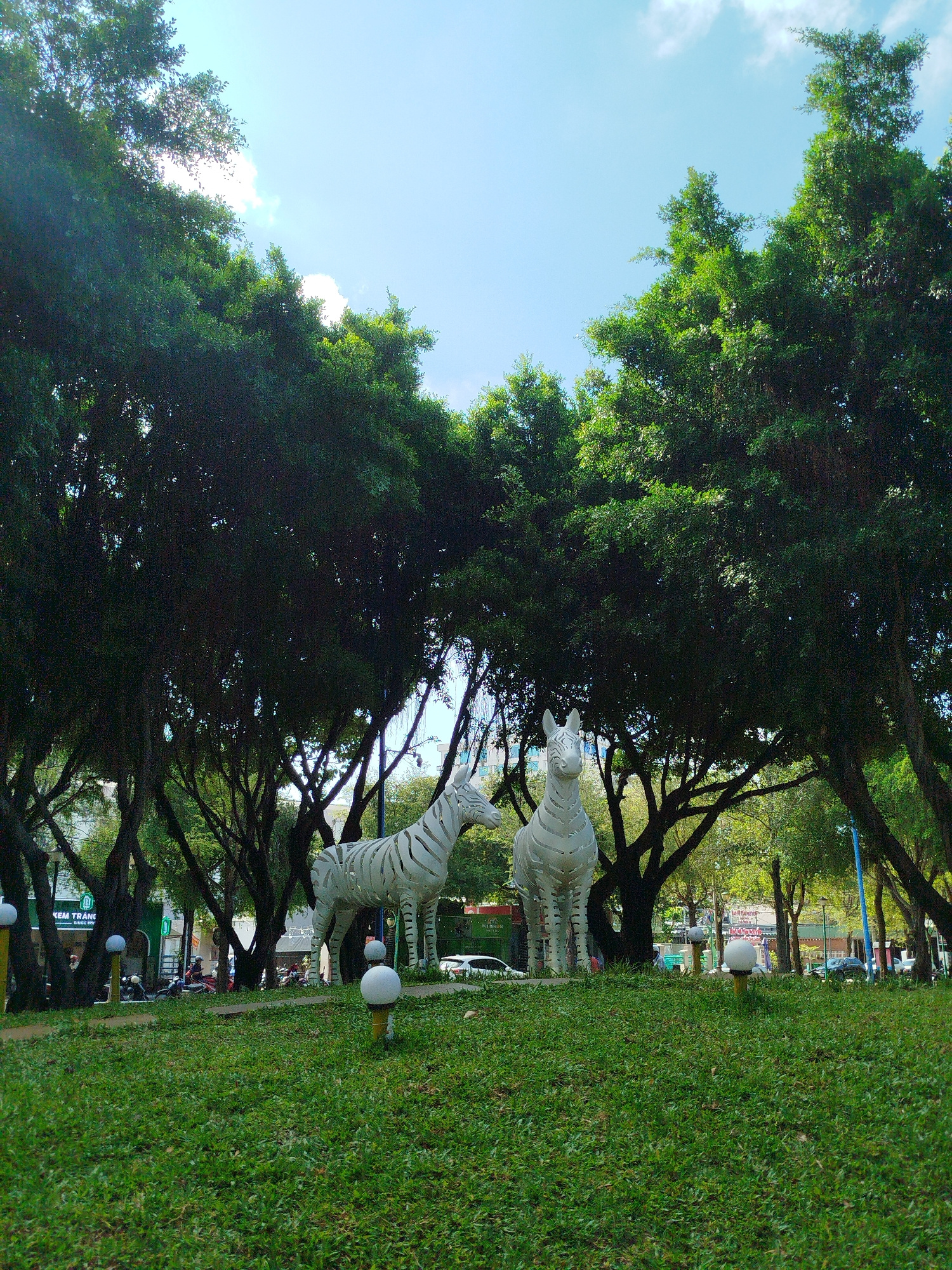 The image depicts a park scene with two stylized zebra sculptures positioned on a grassy area. The sculptures are white with dark stripes and appear to be made of metal. The park is characterized by m…read more