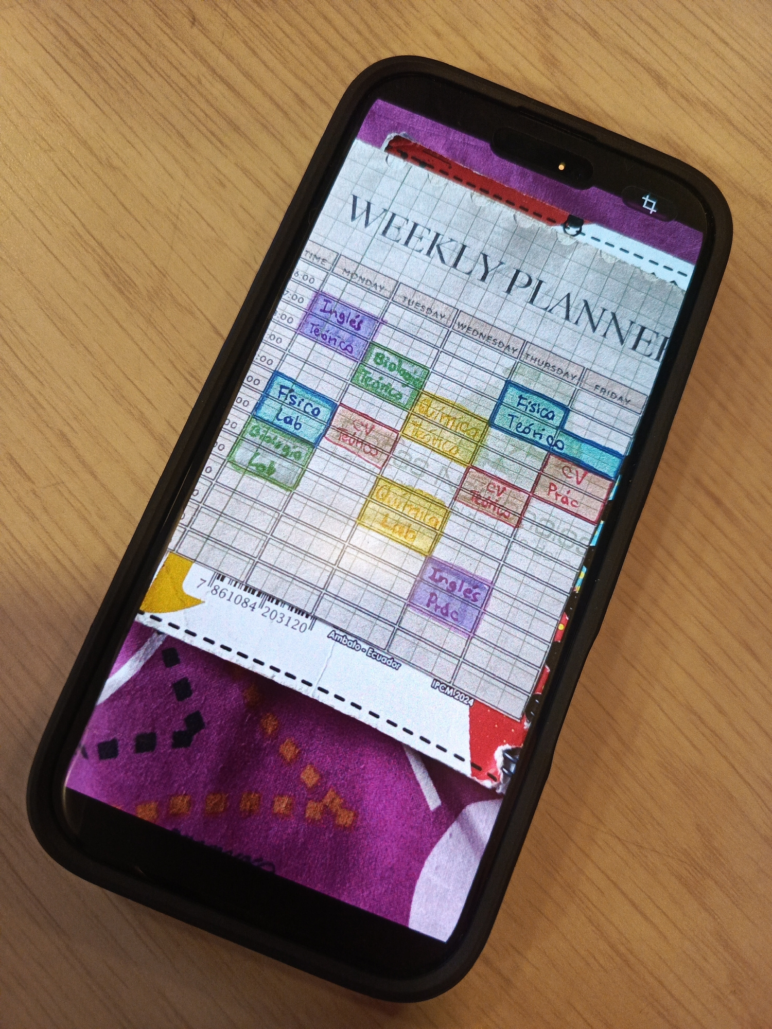 The image shows a cell phone displaying a photograph of a weekly planner. The planner is labeled "Weekly Planner" and has columns for each day of the week. The planner is filled out with handwritten n…read more
