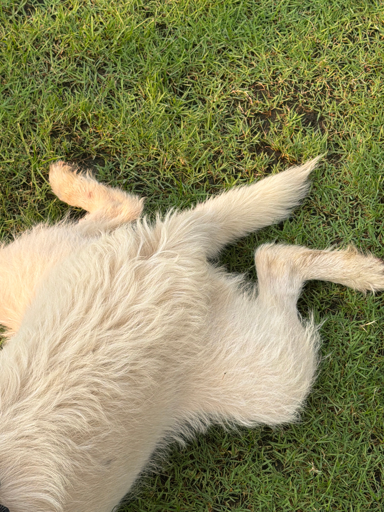 The image shows the rear half of a light-colored, medium to long-haired dog lying on green grass. The dog is positioned on its back, with its legs extended upwards. The location is speculated to be Thβ¦read more