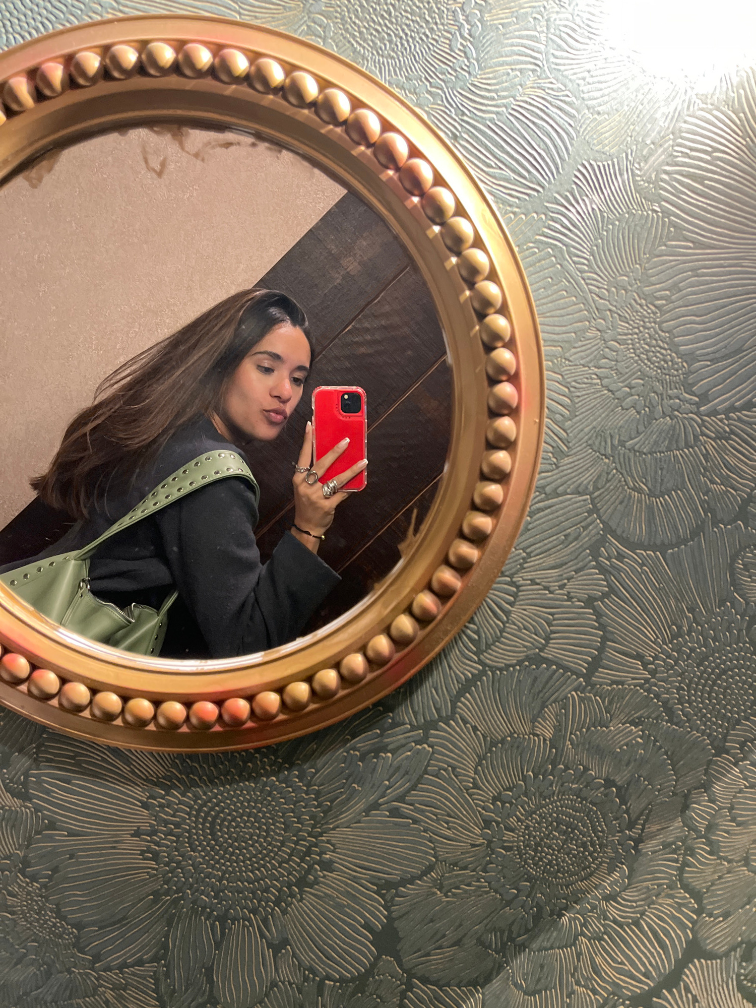 A woman is taking a selfie in a round gold-colored mirror. The mirror hangs on a wall covered with patterned wallpaper in shades of blue and gray, resembling a stylized floral design. The mirror's ref…read more