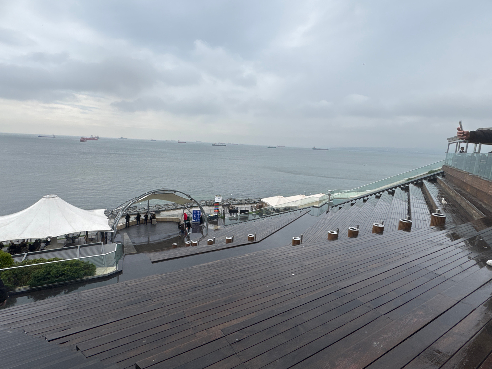 The image depicts a waterside location on a cloudy day in Bakırköy, Turkey. The foreground consists of a wide, stepped wooden deck that appears to be wet from rain. On the deck, there are cylindrical…read more