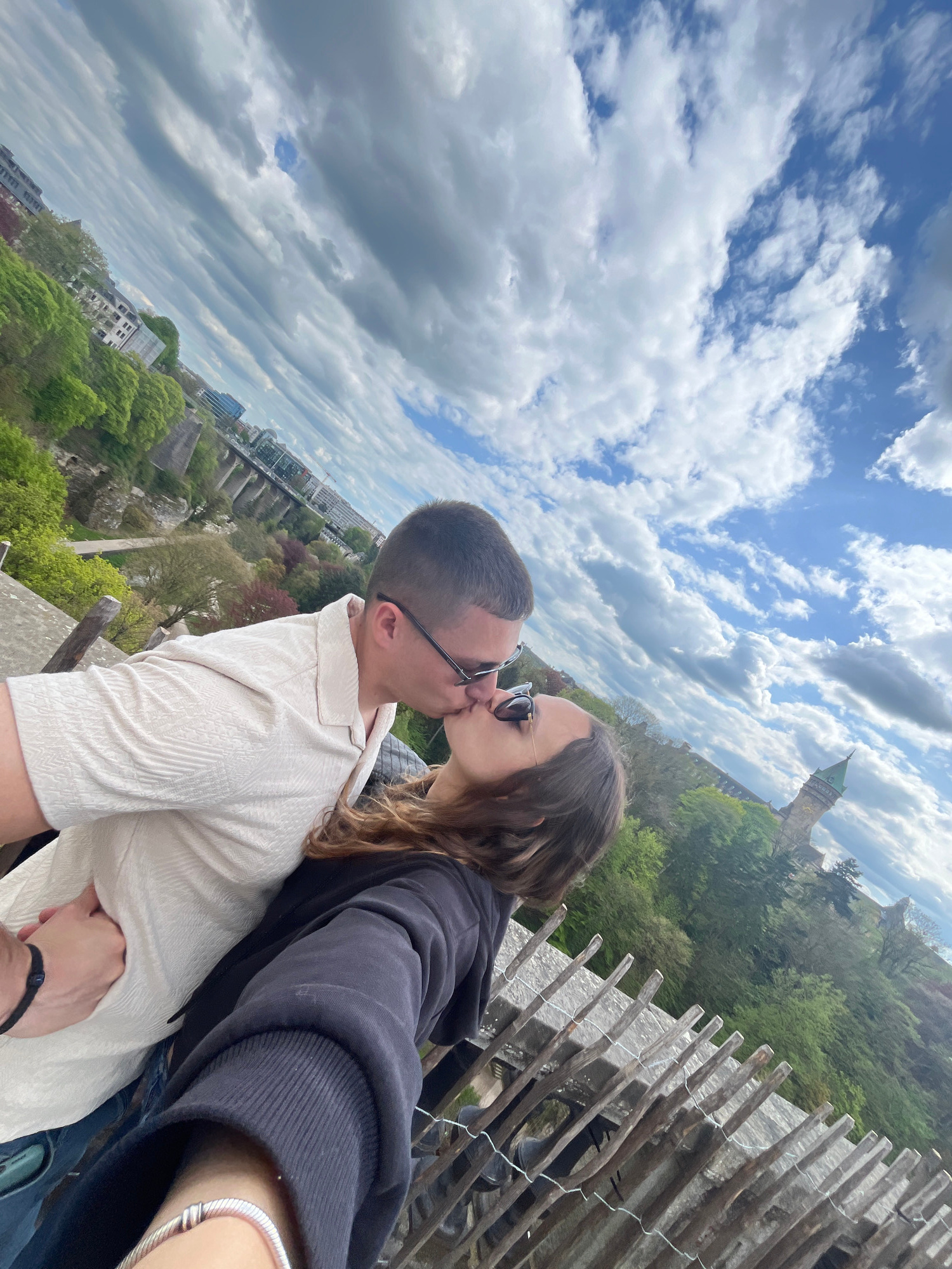 A low-angle, tilted, wide shot features a man and woman kissing on a structure of wood and concrete, with an expansive view of Luxembourg City in the background. The man, with short dark hair, wears g…read more