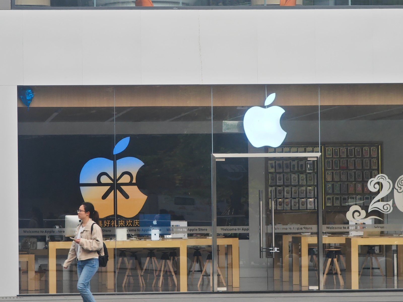 A daylight street-level view captures a modern Apple Store storefront in Yuzhong District, China. The store features a large glass facade, reflecting parts of the exterior environment. A woman in glas…read more