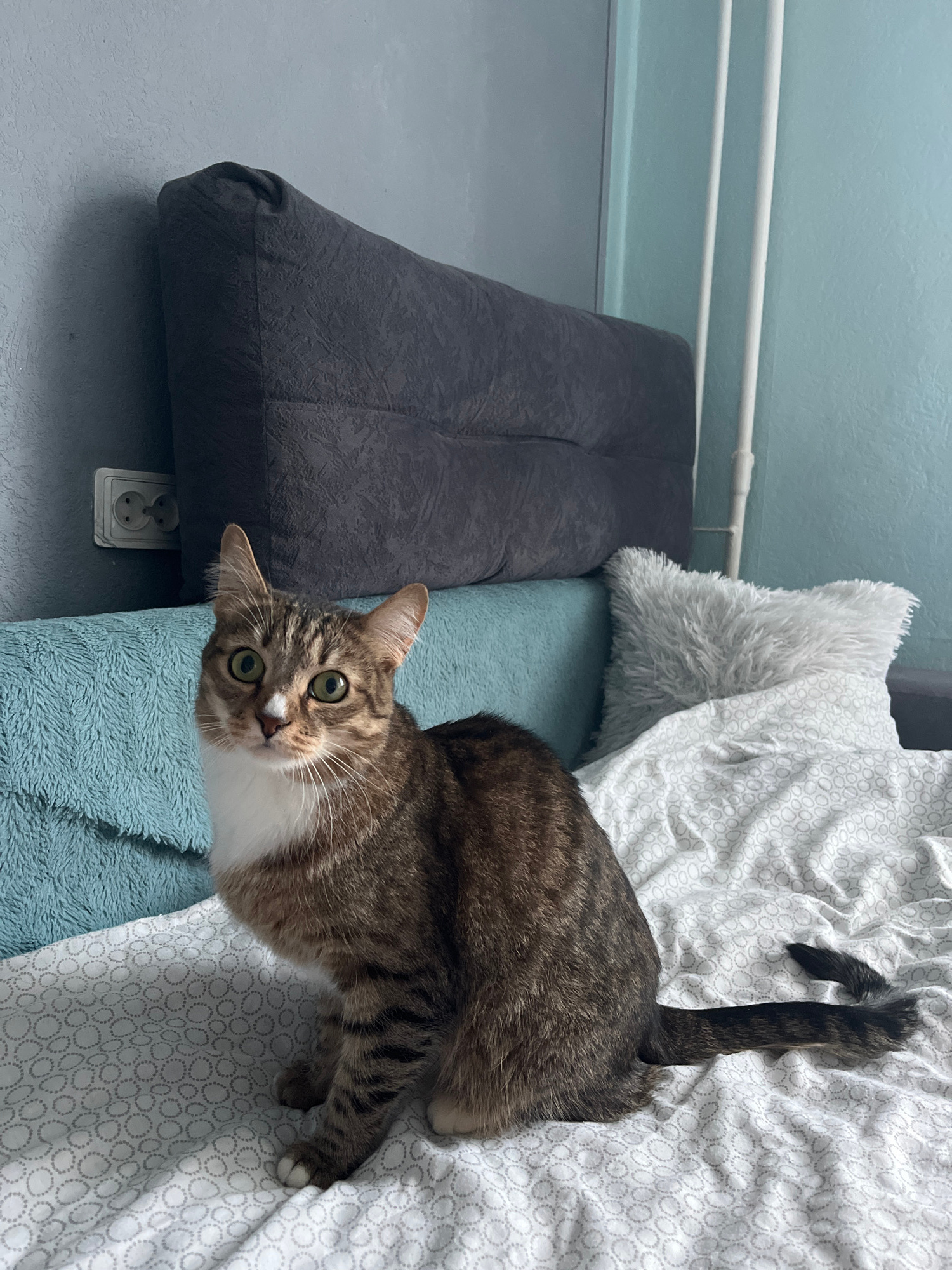 A brown tabby cat with a white chest and green eyes is lying on a bed with white patterned sheets. The bed is adjacent to a gray cushion, and next to it is a blue textured blanket. In the background,…read more