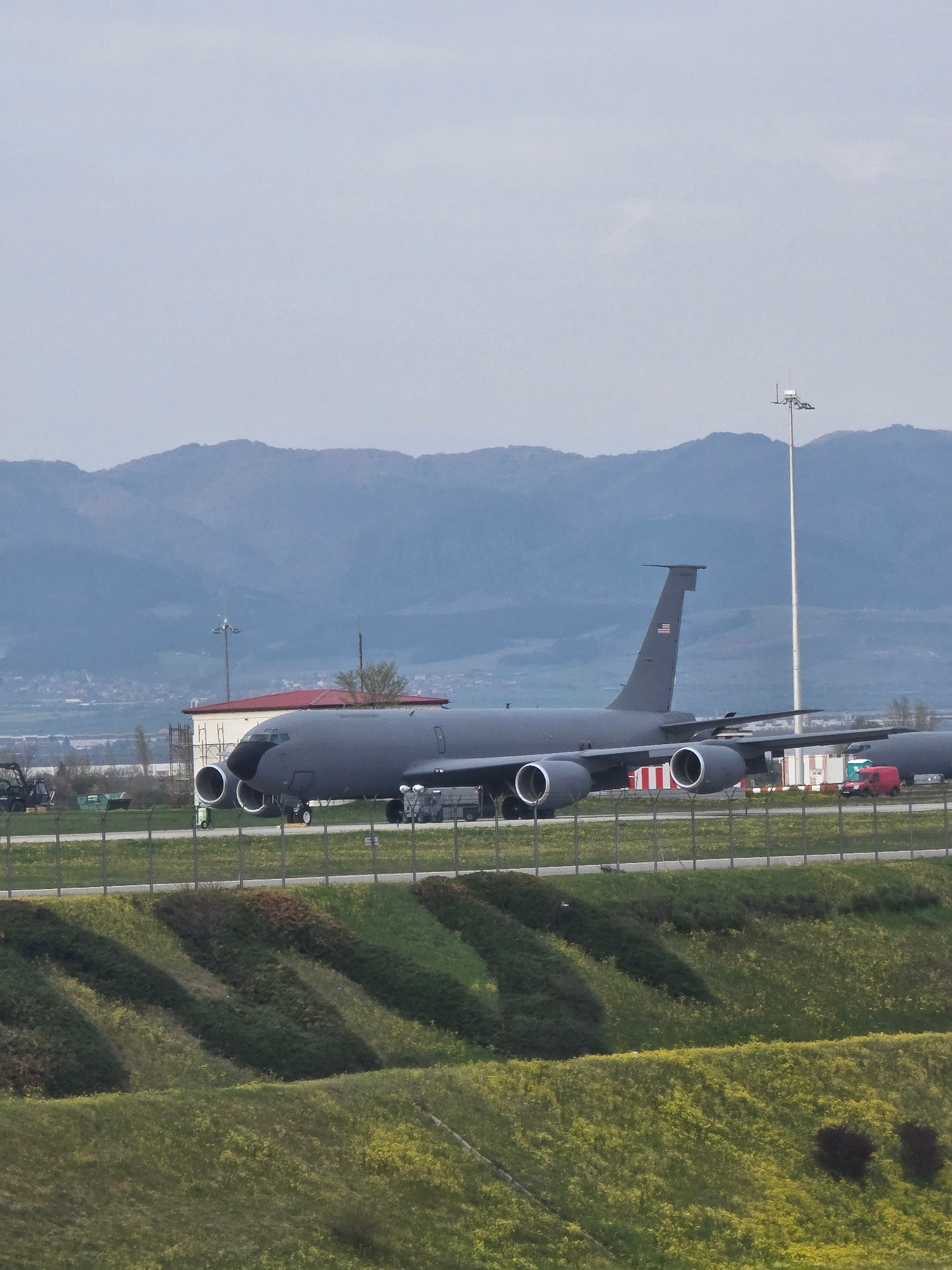 The image shows a large grey military cargo plane parked on an airfield adjacent to a green, grassy area with foliage. In the background, there is a mountainous landscape. The setting might be near th…read more