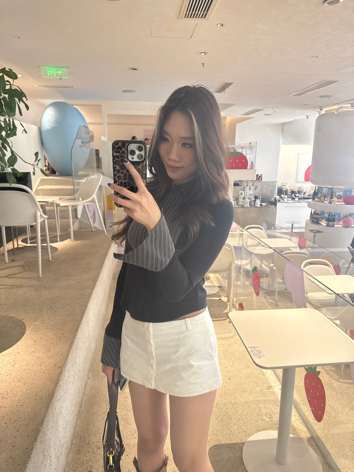 A woman stands in a cafe in 江北城街道, China, taking a selfie. She holds a leopard-print phone in her left hand. The cafe is decorated with strawberry-themed elements. Tables with glass tops and white cha…read more