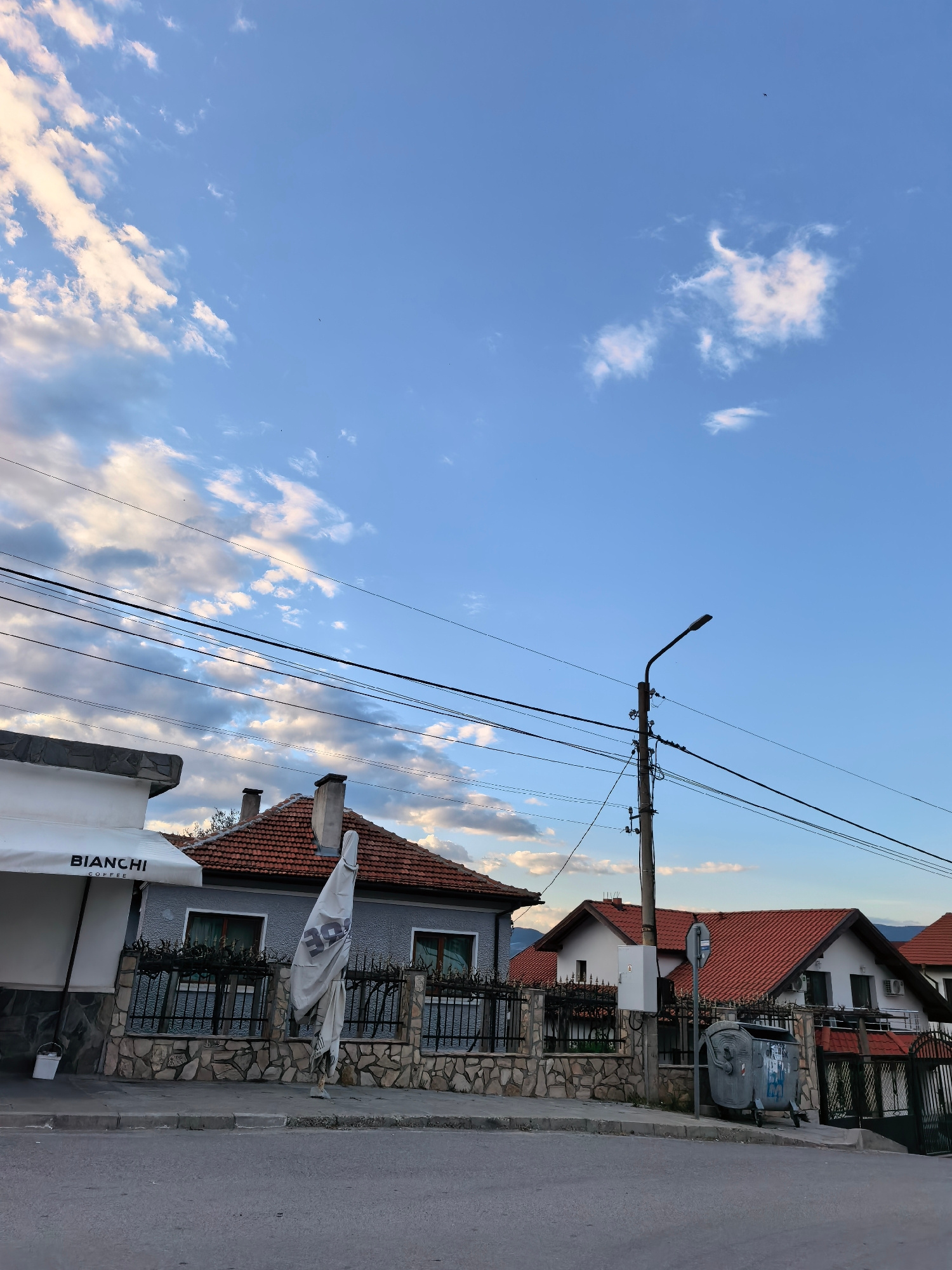 The image captures a street scene in an urban environment. The sky is predominantly blue with scattered clouds. Visible buildings with red-tiled roofs and grey exteriors line the street. A Bianchi Cof…read more