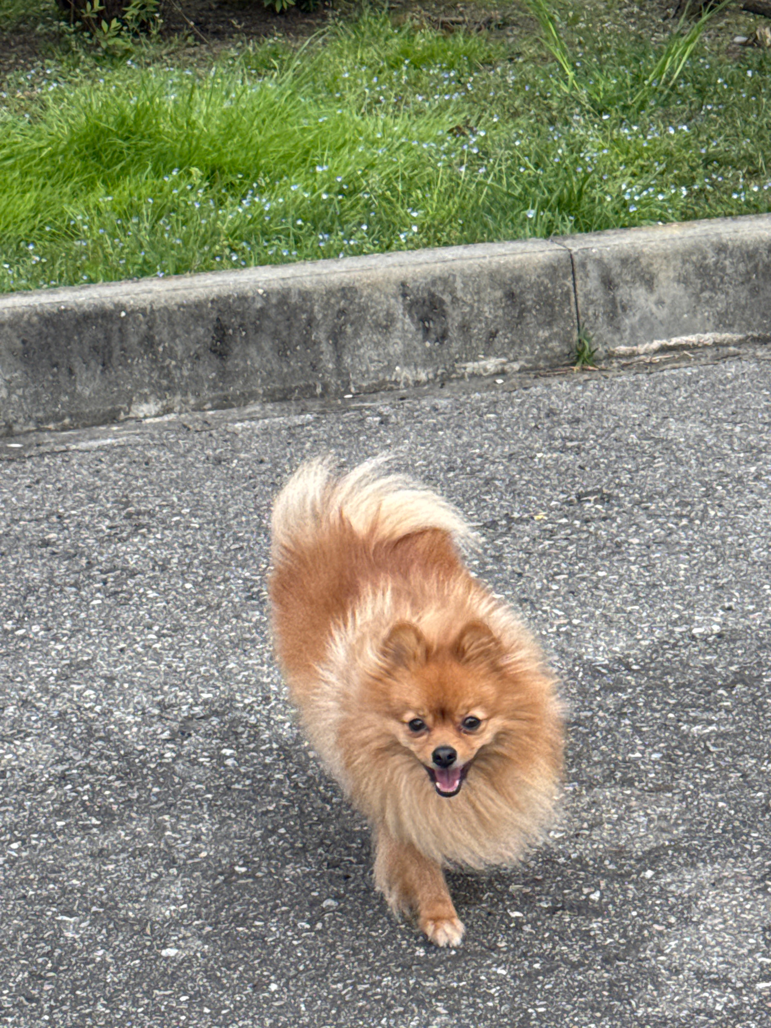 The image is an overhead shot of a small, light-brown Pomeranian dog standing on a gray asphalt surface. The dog is looking up and to the side, its mouth open. To the left of the asphalt is a concrete…read more