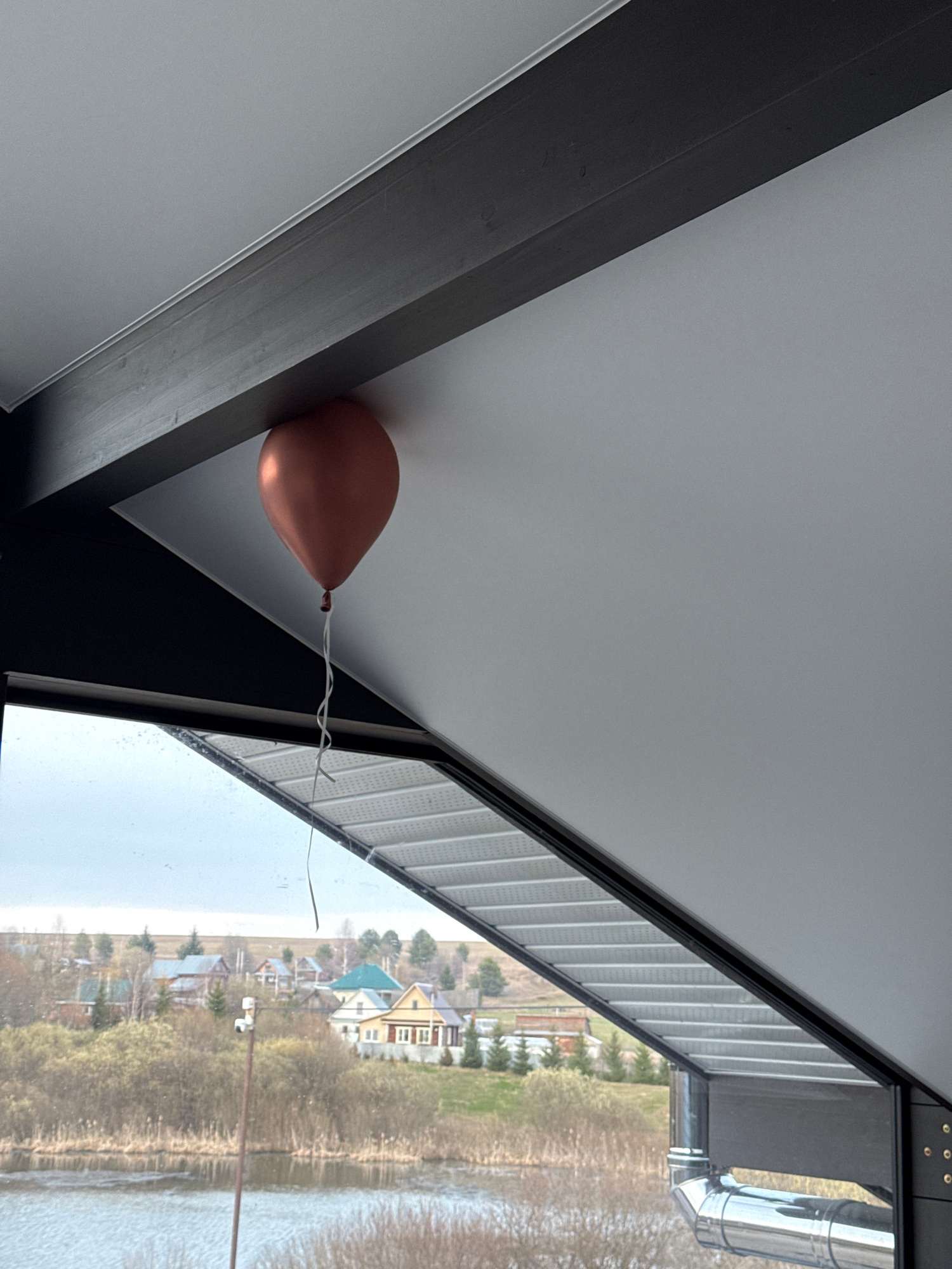 An interior shot looks out through a large, angular window into an outdoor landscape in Karsha, Russia. The room features a light gray ceiling and dark, possibly wooden, structural beams forming geome…read more