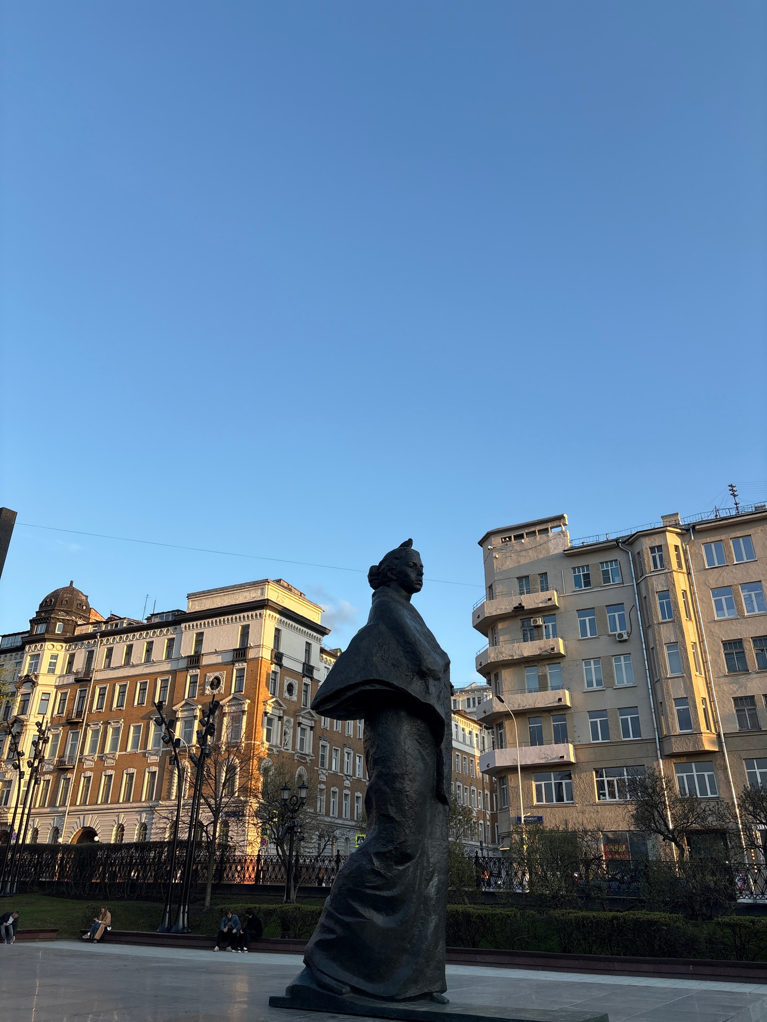 The image shows a bronze statue of a woman, viewed from below and tilted slightly. The statue is positioned in front of buildings with multiple stories and windows. The sky is blue and clear. In the b…read more