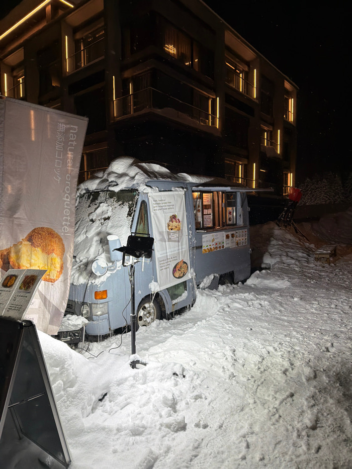 The image depicts a snow-covered outdoor scene at night in Kutchan, Japan. A light blue/grey food truck, heavily laden with fresh snow on its roof and hood, is positioned on a snow-covered ground. Ici…read more