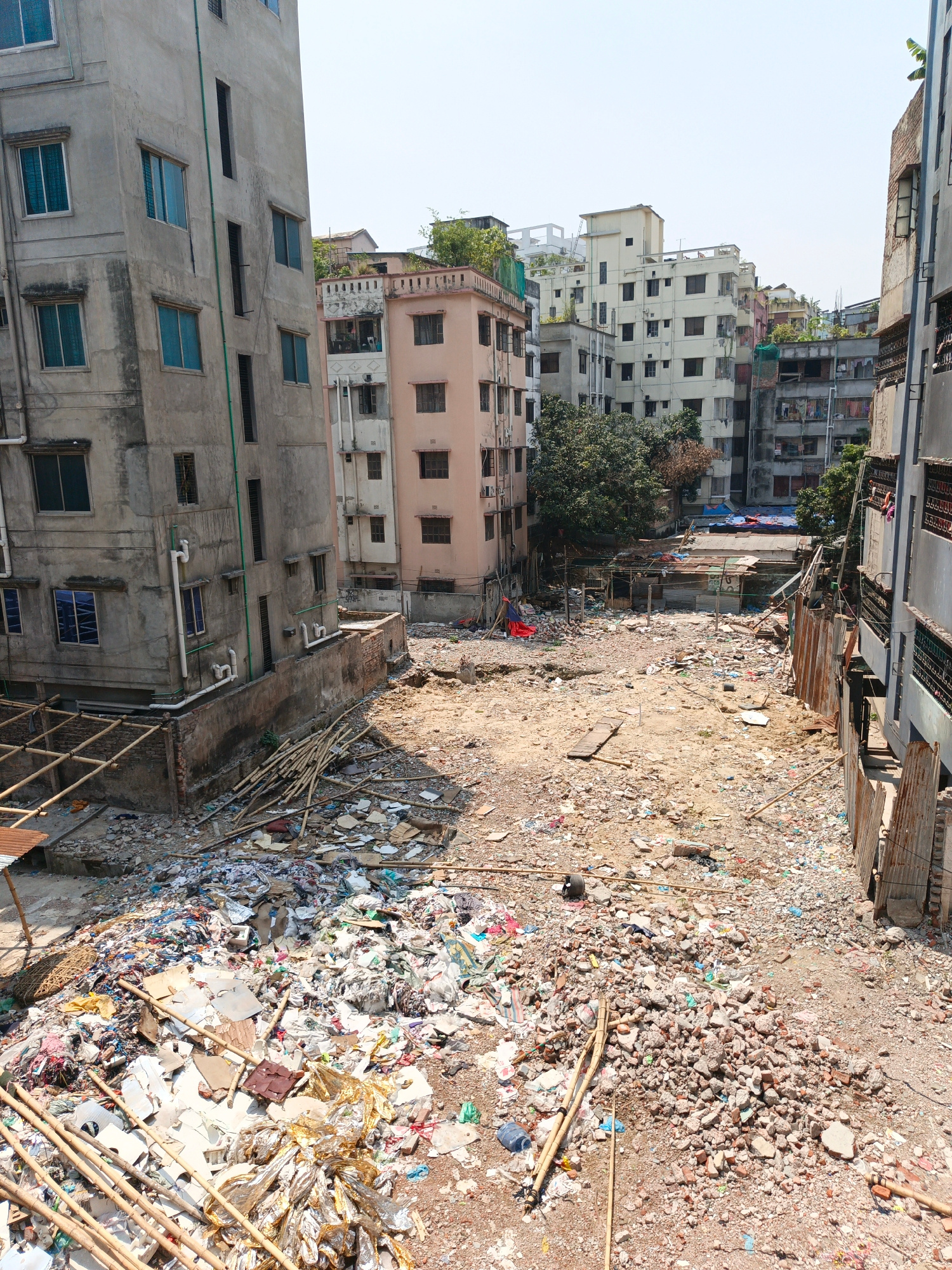 The image shows a vacant lot in Dhaka, Bangladesh, filled with debris and garbage. The lot is surrounded by multi-story buildings, some of which appear to be residential. The ground is covered in a mi…read more