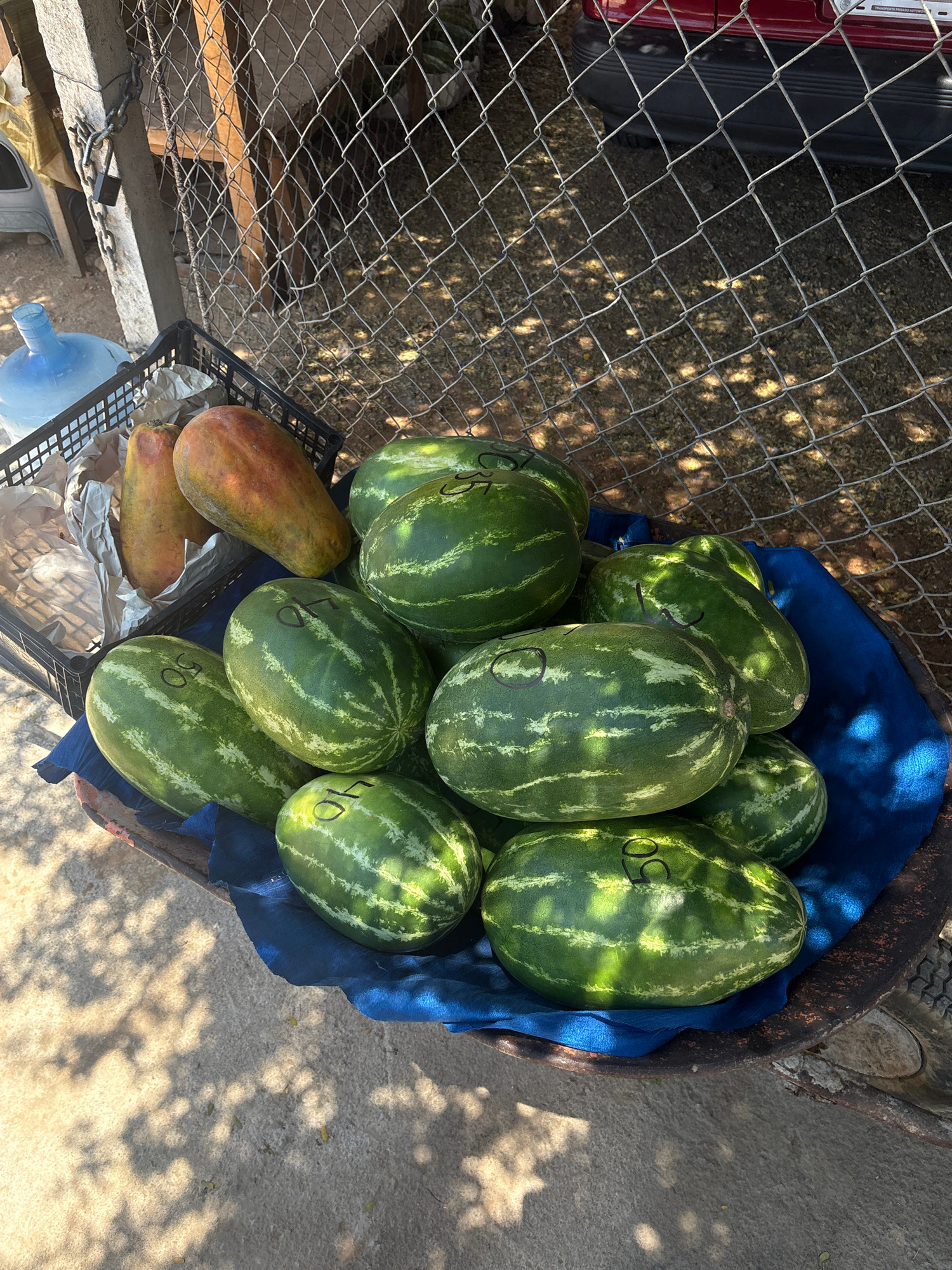 The image shows a top-down view of a collection of objects in Brisas de Zicatela, Mexico. There are approximately nine watermelons, each with a price written on them, ranging from 35 to 50. The waterm…read more