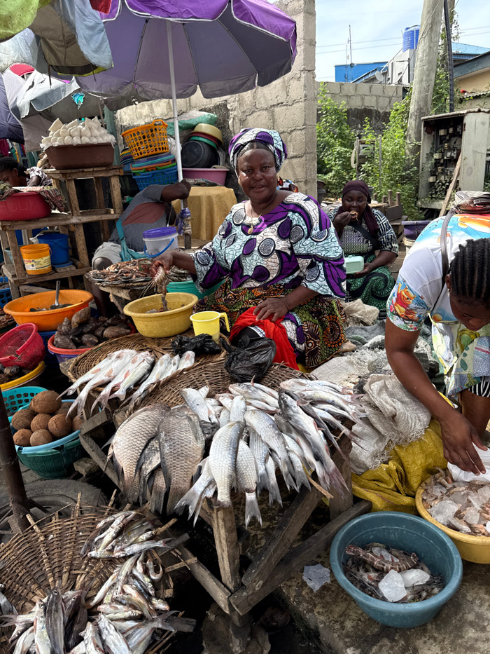 The image depicts an outdoor market stall in Lekki, Nigeria, specializing in fresh seafood and produce. A woman, centrally positioned, wears a purple, white, and black patterned dress and headwrap, ho…read more