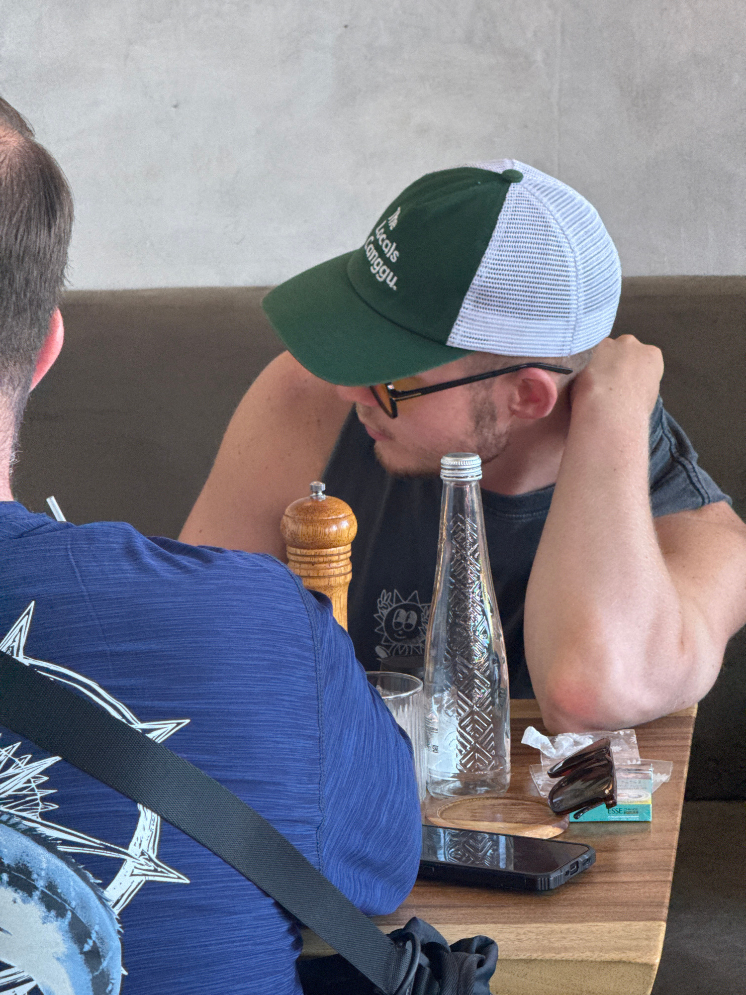 The image depicts two men seated at a table, viewed from above at an angle. One man is wearing a green and white baseball cap with the words "The Locals Canggu" embroidered on the brim, suggesting a l…read more