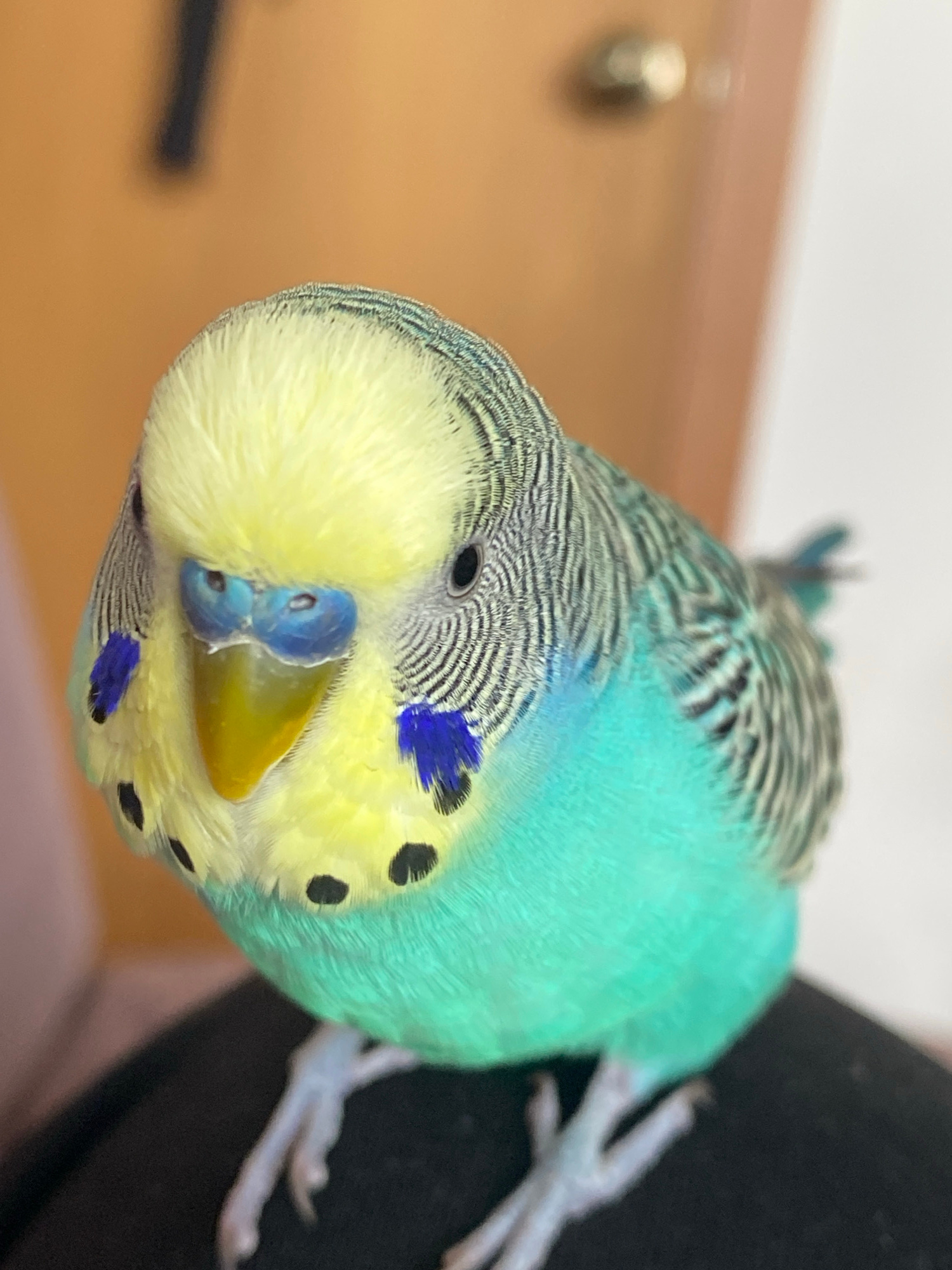 A close-up, slightly low-angle shot of a budgerigar. The bird has a yellow face, a blue cere, and a yellow beak. Its upper body is light blue with black and white scalloped markings. There are dark sp…read more