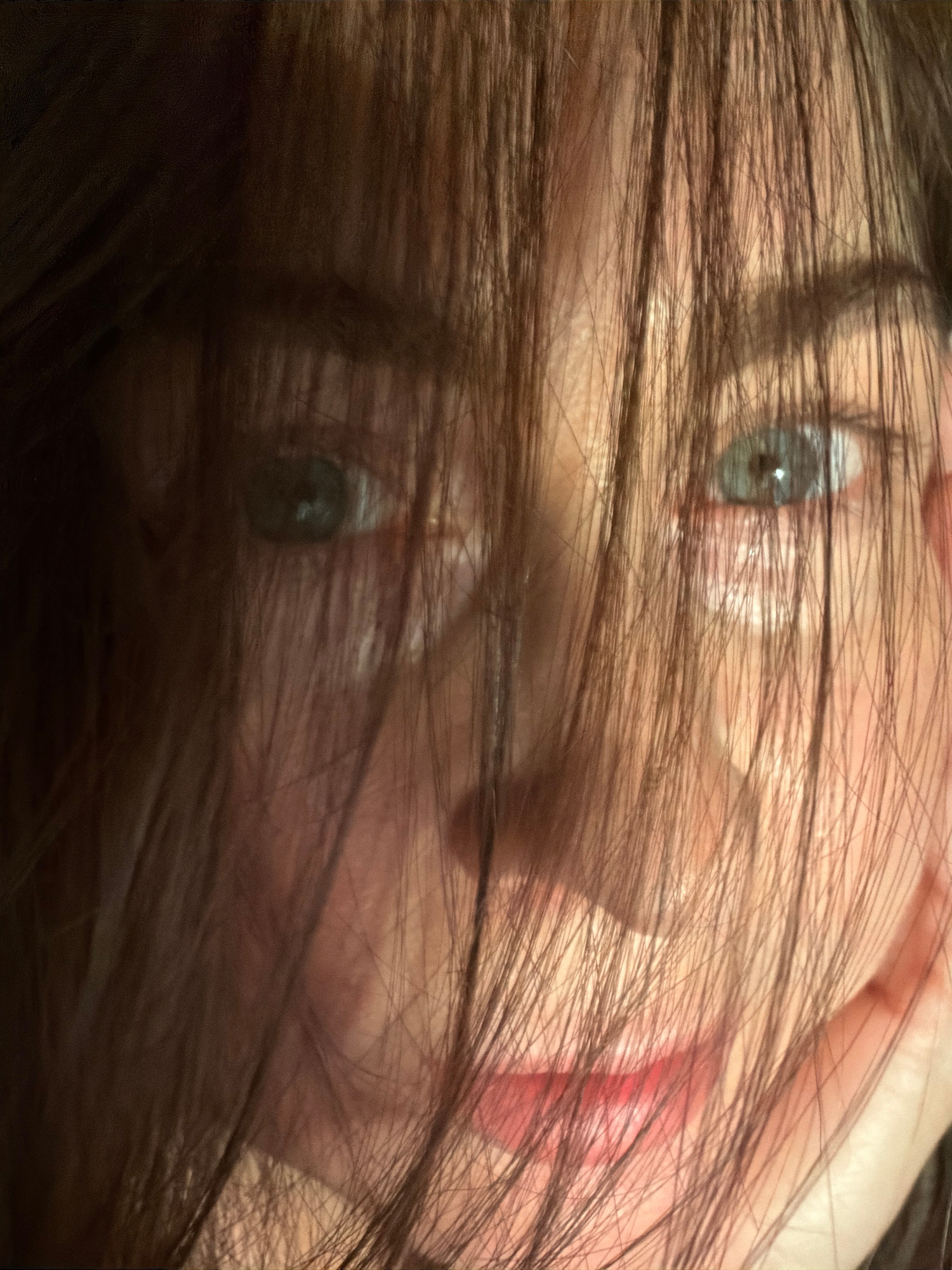 The image shows a close-up of a person's face partially obscured by brown hair. The person has fair skin and blue eyes. A finger is visible near the top of the image, suggesting the person may be hold…read more