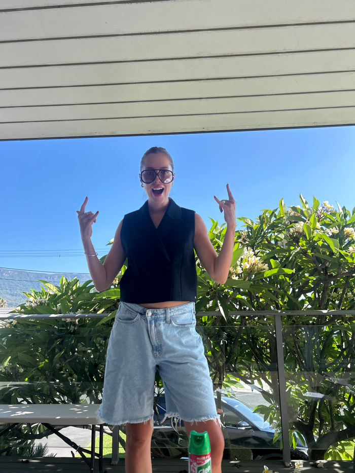 A person wearing glasses, a black top, and denim shorts stands outside, making a "rock on" hand gesture with both hands. The person is looking at the camera with a joyful expression. Background elemen…read more