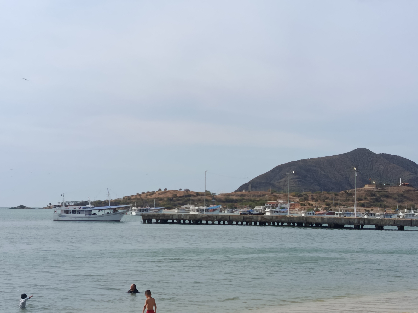 The scene is a view of the harbor area in Juan Griego, Venezuela, under an overcast sky. In the foreground, three people are in the water near the shoreline. One child wears a red bathing suit, anotheβ¦read more