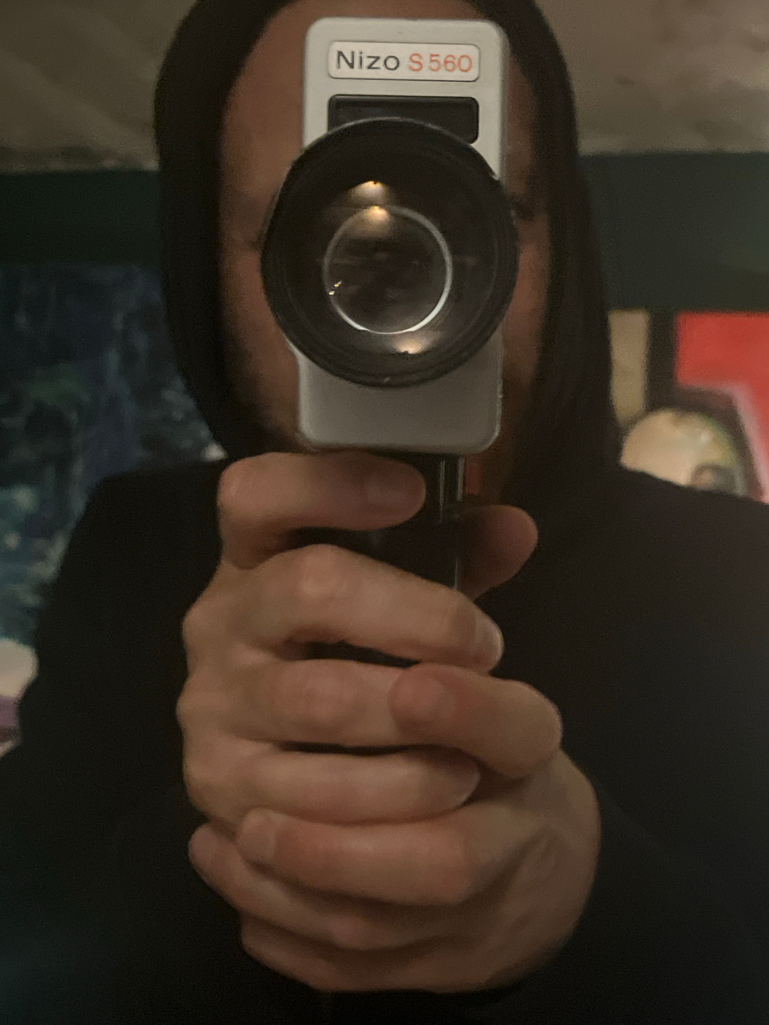 A person is holding a Nizo S560 Super 8 camera, presumably taking a selfie. The background is blurred, but suggests an indoor setting. The location is not discernible from the image.