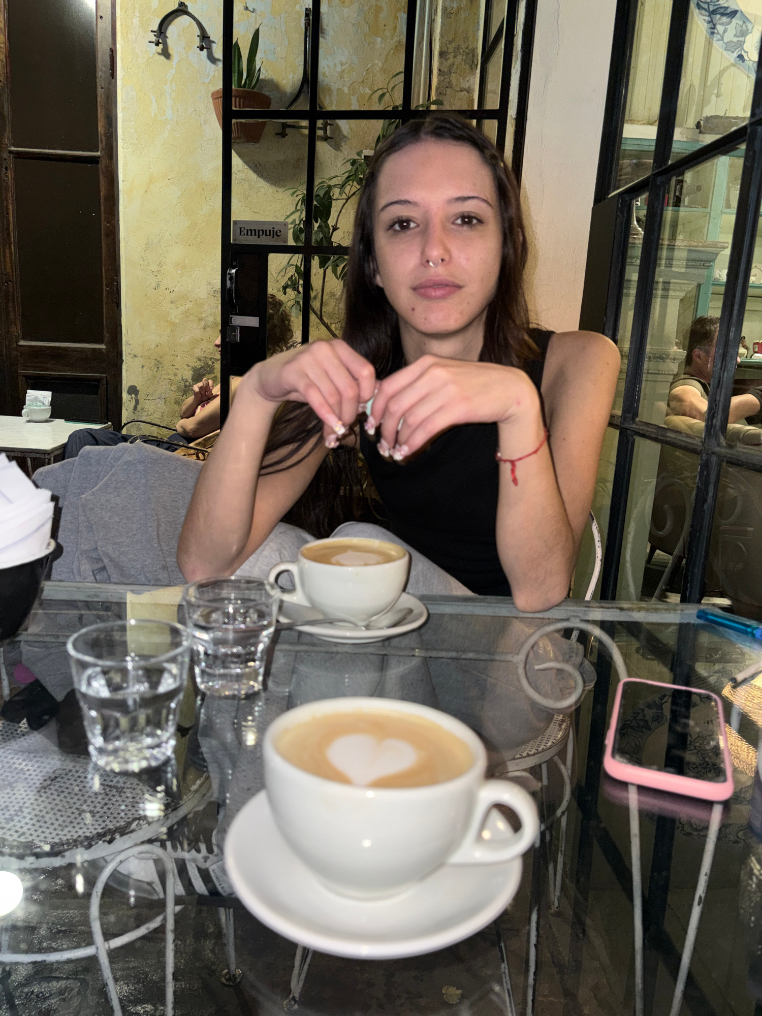 The image depicts a woman sitting at a glass-topped table in what appears to be an indoor cafe. She is facing the camera, with her arms resting on the table. On the table, there are two cups of coffee…read more