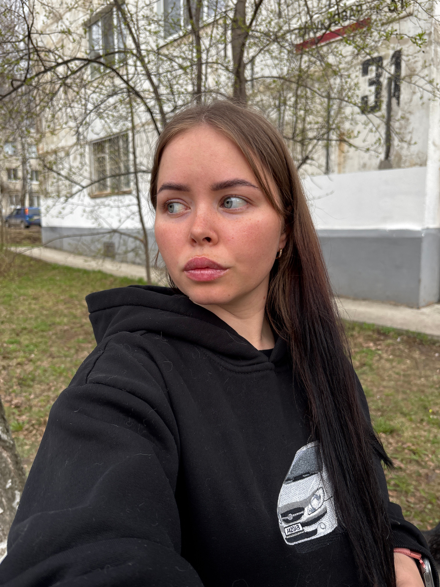 A young woman, likely in her late teens or early twenties, is depicted in an outdoor setting, appearing to take a selfie. She has long, straight dark brown hair, fair skin, and light-colored eyes (app…read more