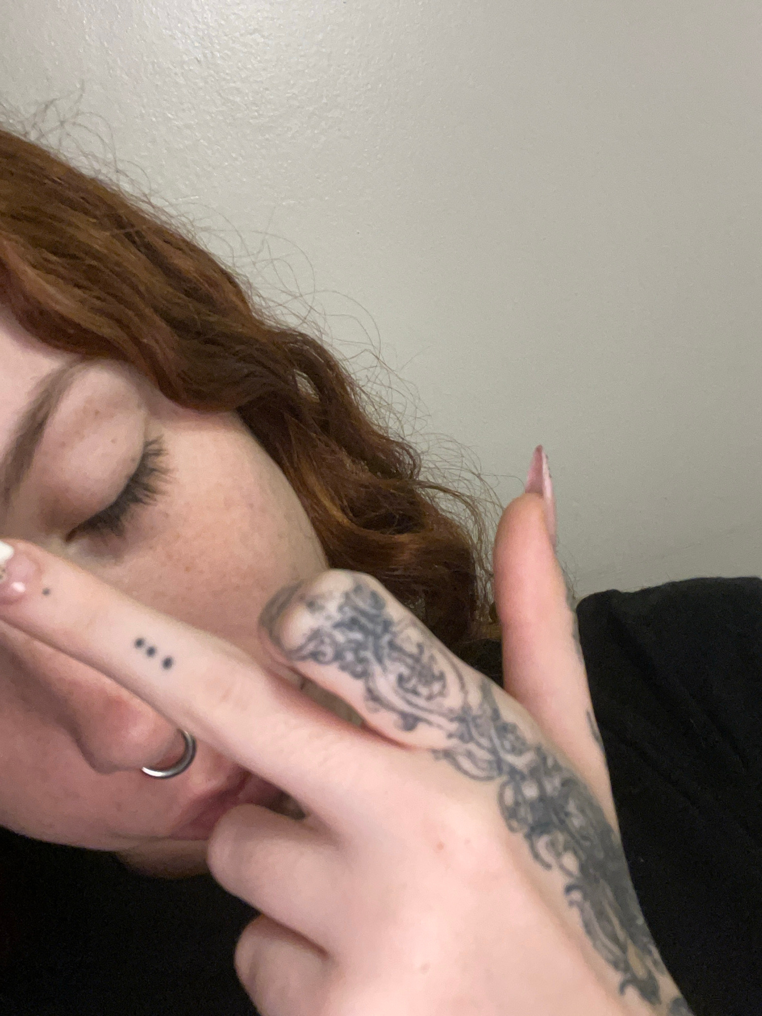 A close-up shot depicts a portion of a person's face, specifically the eye, nose, and part of the forehead. The person has red-brown curly hair and freckles on their face. Their eye is closed with vis…read more