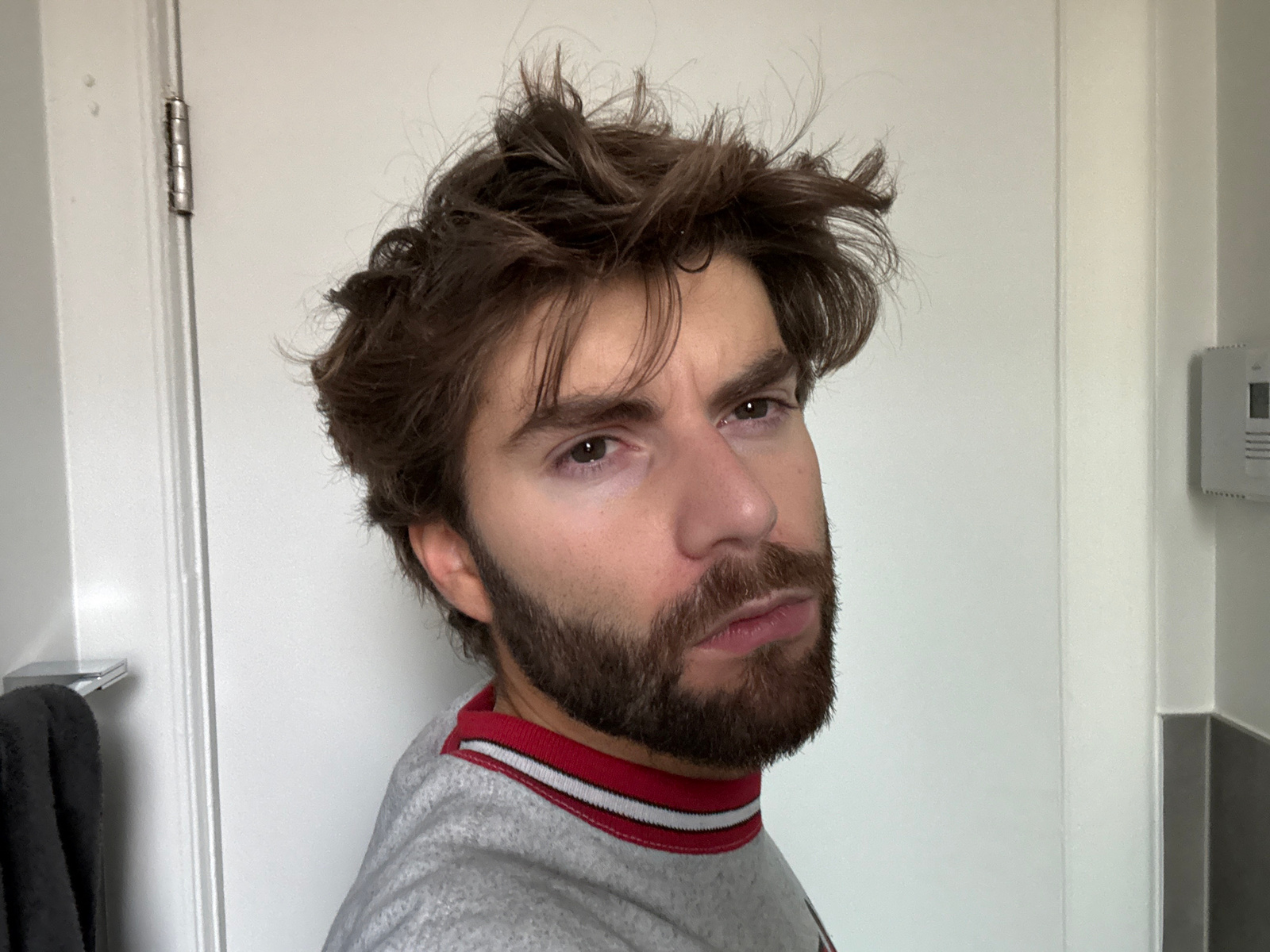 A person with brown hair and a beard is looking at the camera. The person is wearing a grey shirt with a red and white collar. The background consists of a white door with a silver hinge and a dark gr…read more
