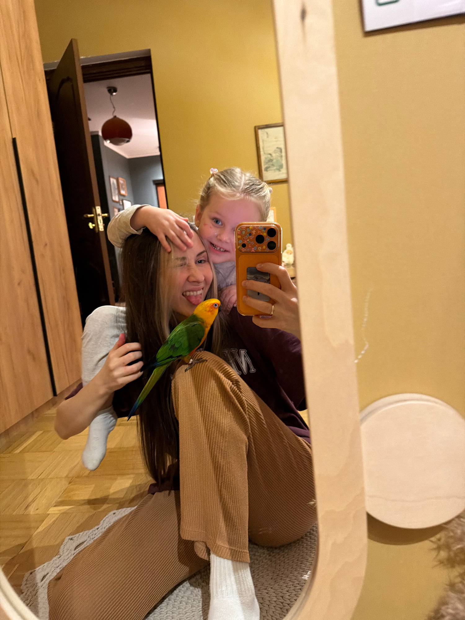 A mirror selfie shows a woman, a child, and a bird in a room. The woman is holding the phone, with a child leaning in close to her. The bird is perched on the woman's shoulder. The room contains a woo…read more