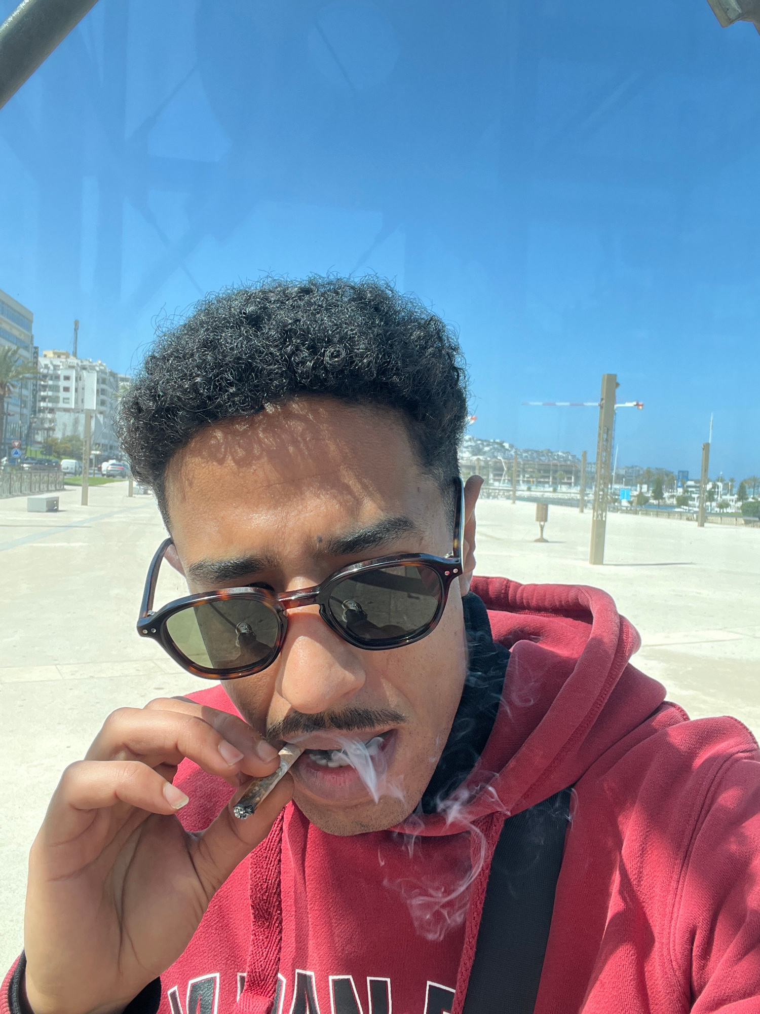 The image depicts a male individual in a close-up outdoor selfie, actively smoking a hand-rolled cigarette. The subject has dark, curly hair and a mustache, wearing tortoiseshell-patterned sunglasses with dark lenses and a red hooded sweatshirt over a black garment. His right hand holds the lit, hand-rolled cigarette near his mouth, from which visible plumes of white smoke are exhaling. The background reveals a sunny coastal urban environment in Tanger, Morocco. Visible elements include a wide, light-colored paved promenade, a sandy beach, and the sea on the right. The left side of the background shows modern, multi-story buildings, a street with parked vehicles, a round blue traffic sign, and a palm tree, all under a clear blue sky. | Open Wire