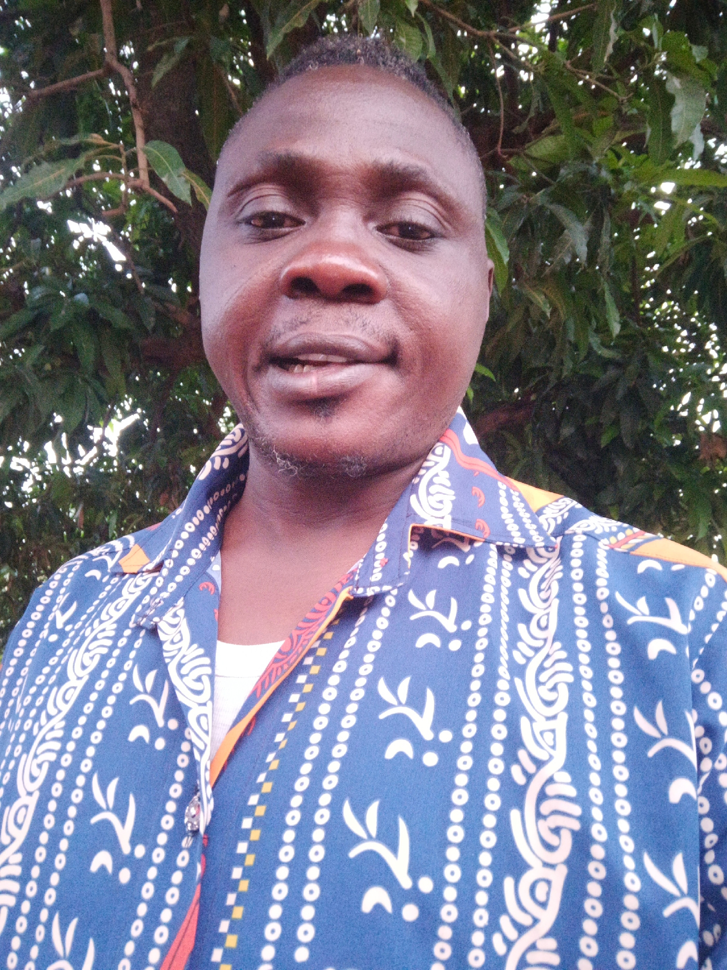 A man stands outdoors, likely in Akwanga, Nigeria, evident from visual cues possibly linked to regional fashion or vegetation. He is centered in the frame, wearing a blue patterned shirt over a white…read more