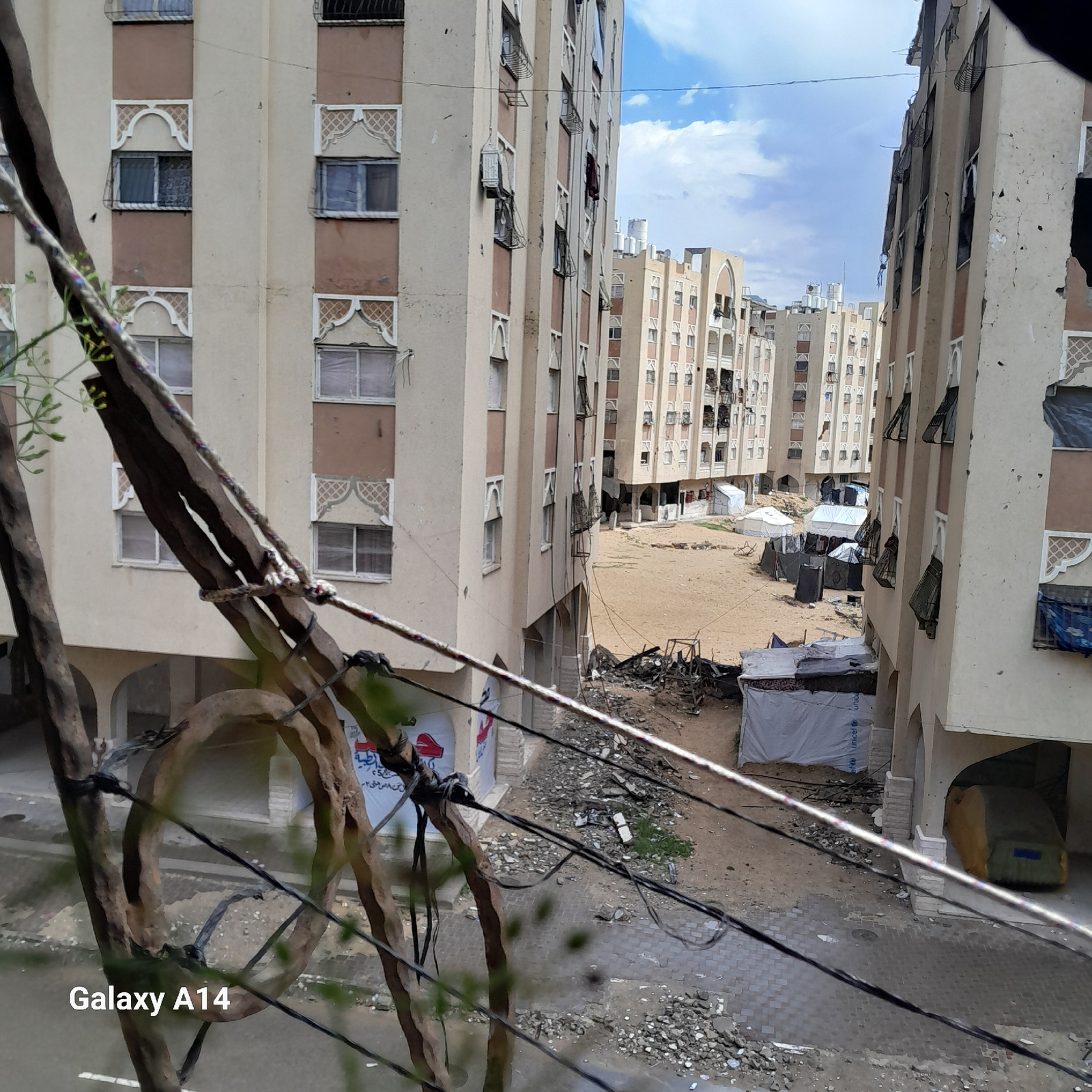 The image depicts an urban environment, possibly in Khan Yunis, Palestinian Territory, based on available information. Tall, multi-story residential buildings with repeating window designs line the st…read more