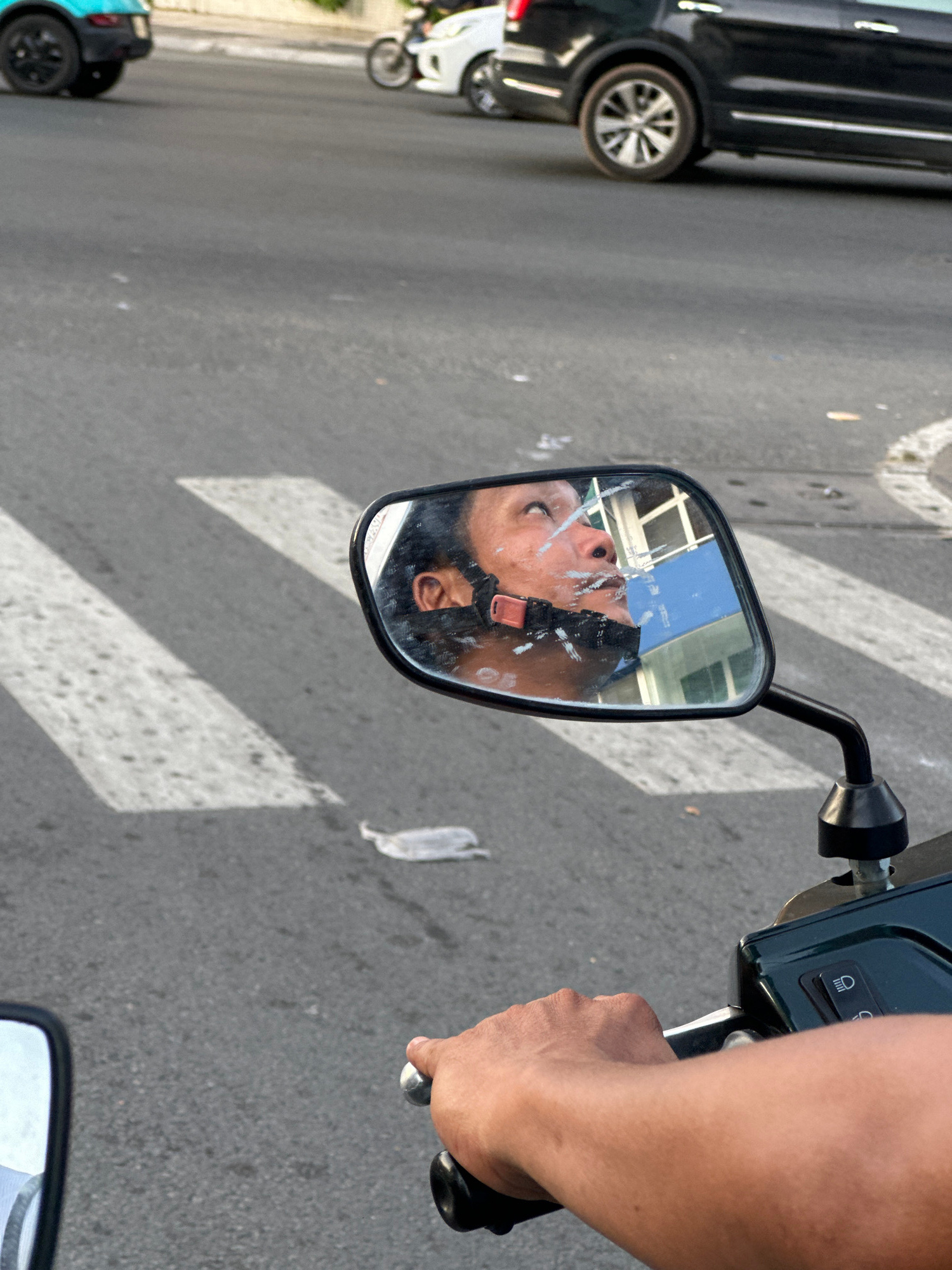 A street in Thủ Đức, Vietnam, seen from the perspective of a person riding a motor scooter. The reflection in the scooter's side mirror reveals the rider's face wearing a face mask and possibly a helm…read more