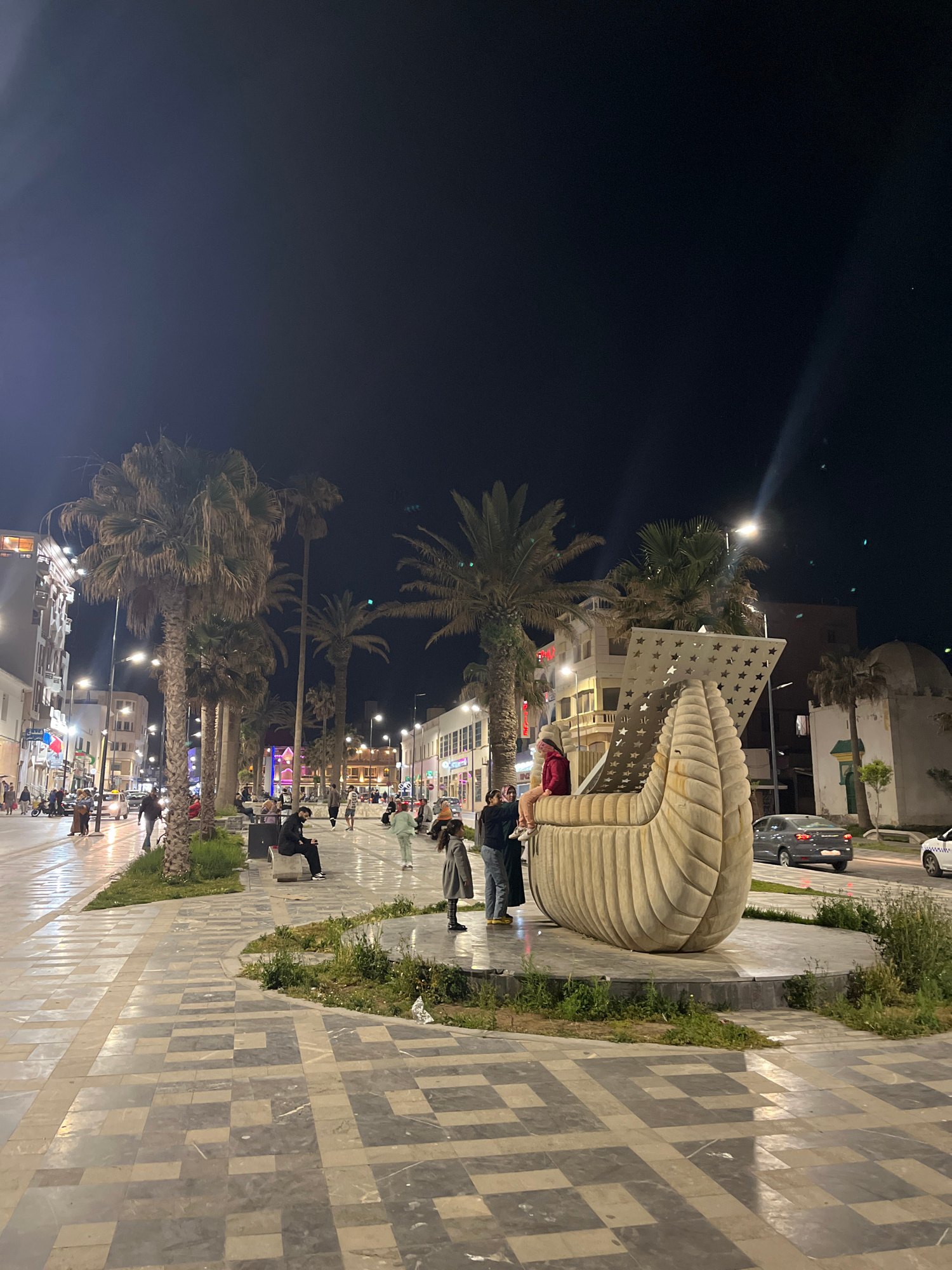 The image captures a lively night scene on an urban promenade in Safi, Morocco. The dark sky indicates evening, with the area brightly illuminated by numerous streetlights and the lights emanating fro…read more